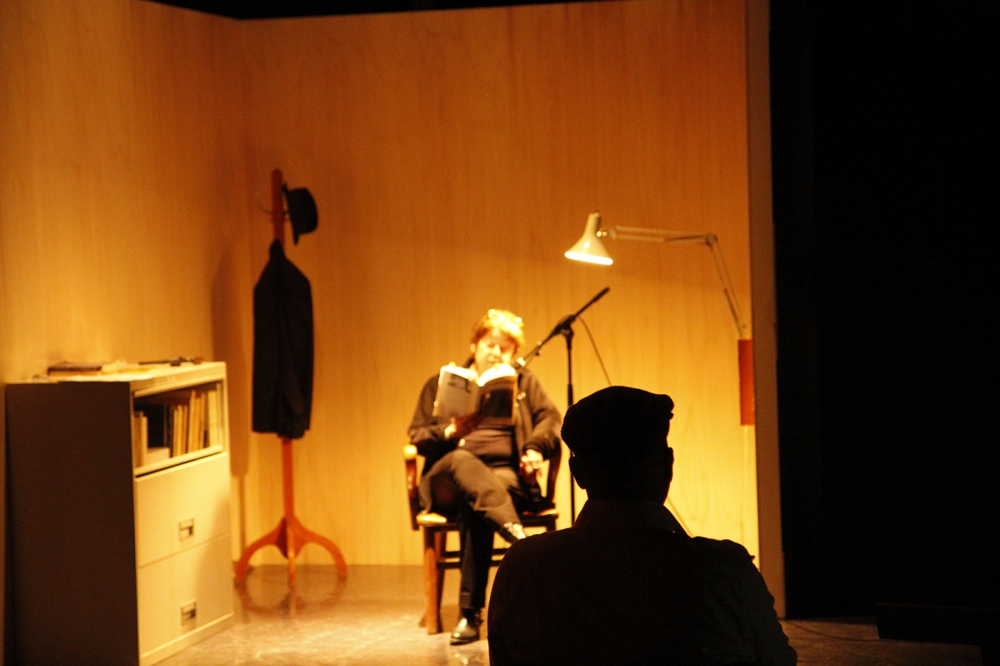 La proposition débute par une discussion explicative autour du livre, de la création du spectacle et de ses enjeux principaux. La traduction, nous dit-on, est à la fois l’entrée et la sortie du projet. L’invitation à traduire à notre tour est lancée mais nous sommes avertis : « le désert est indescriptible comme le sont l’immensité, la liberté ou le danger de mort. » Le désert, synthèse de tous les dangers, nous guette. Les voix off des personnages prennent peu à peu possession d’une narration fragmentée. Les auteurs, assis face à face, se lèvent et renversent alors la table. Celle-ci devient écran à la fiction : le dos d’un divan y est projeté et les auteurs s’y installent. Après avoir « mis la table » et en avoir subverti l’usage, ils n’ajouteront que peu de commentaires. Comme le corps la nuit, nous dit-on, l’écriture change définitivement de rythme. Se déploie alors au fond de la scène un assemblage vidéographique finement composé. Le quatrième mur ne disparaît pas, mais est plutôt mis en lumière : ensemble de face-à-face rebondissant sur le plat des écrans, ricochet de regards. « N’est-ce pas l’expression du regard qui permet de distinguer parmi les outils, les armes et les ornements comment la mort peut être vaincue ? », écrit Nicole Brossard.