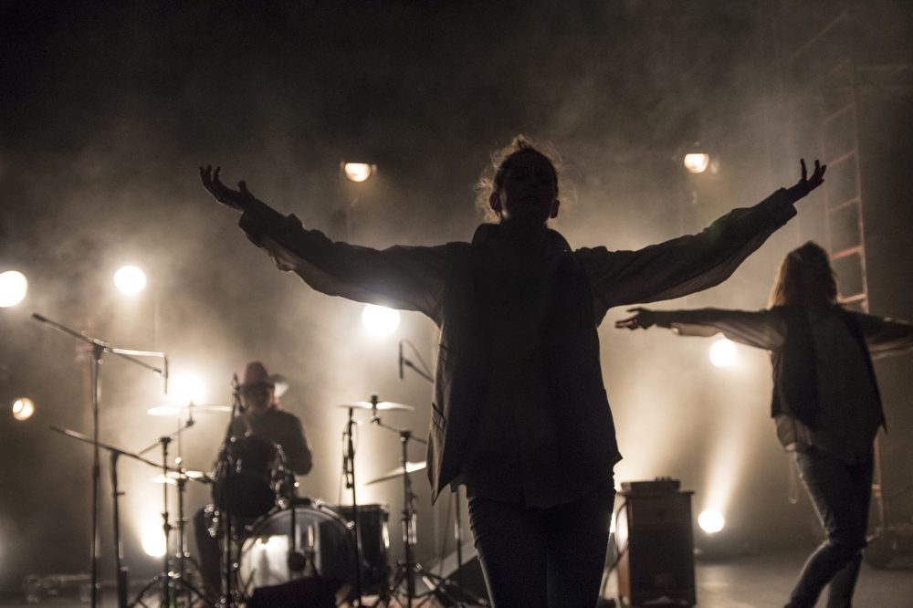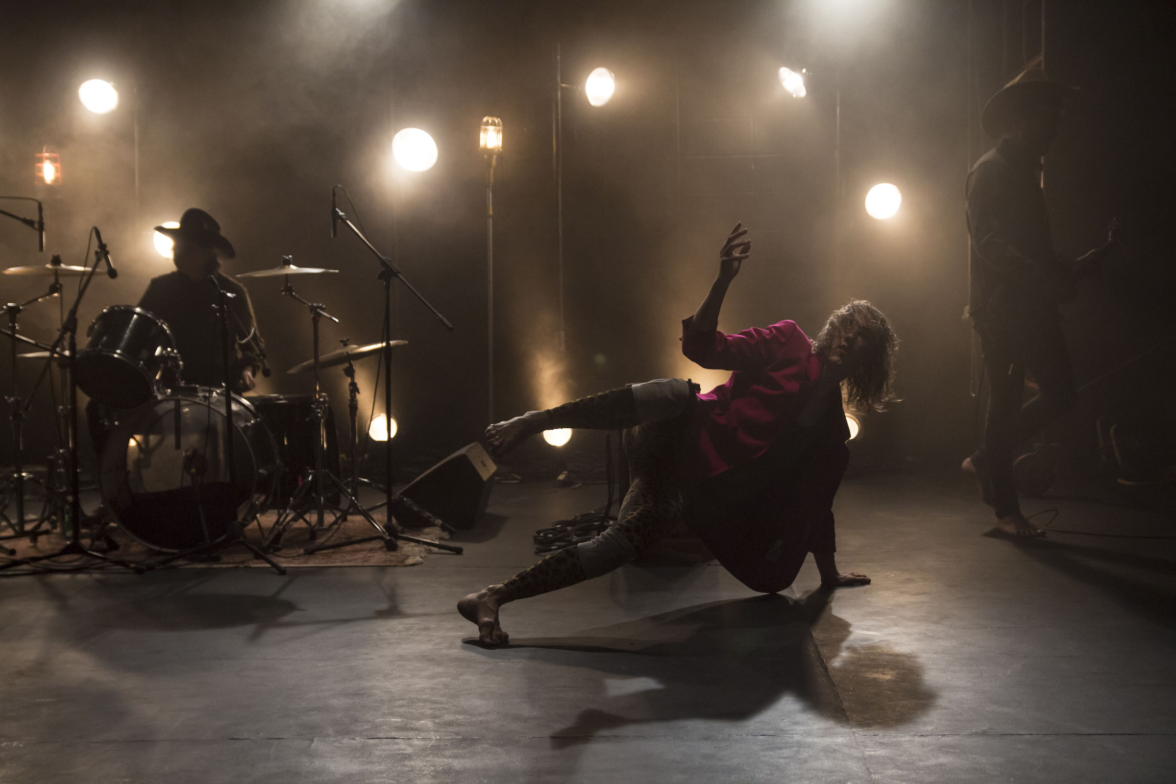 Tout concourt à nous exciter et à nous faire trouver dans l’altération de nos sens quelque confort dépossédé. Notre ouïe ne sera pas en reste : la musique y est véritablement assourdissante (j’ai choisi de ne pas enfiler les bouchons pour oreilles qu’on nous a remis à l’entrée), gracieuseté du formidable power trio de noise-rock formé de Jackie Gallant (batterie, ex-Lesbians on Ecstasy) et des membres de Dead Messengers Roger White (guitare électrique) et Ted Yates (claviers), dont la présence physique, jamais statique, est aussi importante que celles des danseurs.