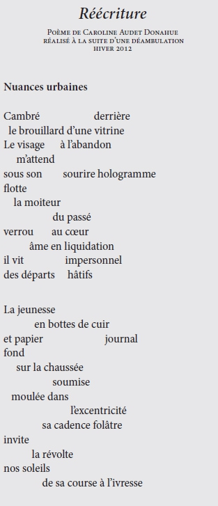 Marqué par plusieurs étapes de réécriture, Lire la rue, marcher le poème – Détournements didactiques est à l’origine un article récipiendaire du Prix d’innovation en enseignement de la poésie décerné par le Festival international de la poésie de Trois-Rivières en 2011, La (dé)marche du poème. L’essai s’adresse certainement à des initiés de la salle de cours mais aussi à ceux rompus au défi de l’écriture. Il faut dire que le thème de la déambulation est présent chez Ruiz depuis son premier recueil Qui s’installe (Noroît, 2008) jusqu’au récent Désert et renard du désert (Noroît, 2015) qui prend appui sur une trajectoire urbaine. De son côté, Marcil signe ici son premier livre — bien qu’il ait publié dans quelques revues (Exit, Lapsus, Lieu commun) —, mais interroge aussi la notion de l’art dans l’espace public, notamment par implication au centre d’essai en art actuel le 3e impérial situé à Granby. Chacun de leur côté ont éprouvé en classe cette approche du poème dans des contextes différents (l’un à Granby, l’autre à Montréal), mais ont uni leurs voix dans une écriture à quatre mains indissociables.