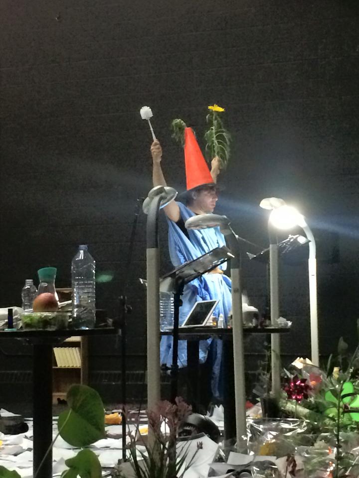 En guise de seule décoration de l’officine, les célèbres tournesols du Suicidé de la société rappelant l’hommage qu’Artaud rendit d’un jet, dit-on, au peintre hollandais en qui il voyait un «formidable musicien», martelant du même coup qu’il n’était pas fou. Difficile de ne pas y voir la mise en abyme d’un Lapointe désirant faire entendre la masse considérable – 28 tomes au total – des écrits d’Artaud qui fut longtemps interné. Comment, par exemple, ne pas être frappé par les très nombreuses concordances des mots d’Artaud et de la performance de Lapointe qui les découvrait en même temps que les spectateurs ? Ainsi Artaud recevait-il sa première injection en même temps que Lapointe se faisait mettre un soluté… pendant que le premier préférait vanter les mérites de l’homéopathie. Comment ne pas constater qu’à de nombreuses reprises, chez les deux hommes, le corps et la tête en venaient à faire des choses différentes ?
