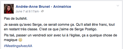 Une certaine Andrée-Anne Brunet, dont je ne savais absolument rien jusqu’à la semaine dernière, «a développé le concept des Meetings avec AA afin de pouvoir discuter avec des artistes qu’elle trouve inspirants sur des sujets qui l’interpellent». Entre le vieillissement et les rides de Janine Sutto, la négritude de Widemir Normil et le toupet de Vanessa Pilon, l’animatrice et productrice de cette nouvelle série-web d’entrevues a cru bon – et je l’en félicite – d’aborder la question de la critique en invitant le comédien et metteur en scène Serge Postigo. Et c’est sur sa page Facebook qu’on trouve la seule explication sur son choix d’invité pour traiter d’un sujet aussi épineux :