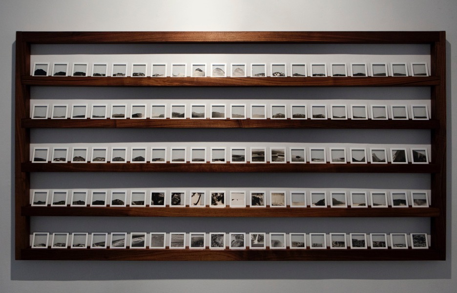 Tout juste en face, Hajra Waheed a juxtaposé des diapositives de verre dans une petite étagère fixée au mur. On est tout de suite tenté de parcourir les images de gauche à droite et de haut en bas à la recherche d’un récit, d’indices qui pourraient donner l’impression d’une évolution d’une image à l’autre. On cherche en vain une figure humaine qui pourrait servir de personnage principal : un être qui parcourrait les montagnes, les lacs, les forêts. Son absence hante chacun des paysages, si bien qu’elle en devient le moteur de tous les récits possibles, projetés par le visiteur qui se retrouve malgré lui dans une distance intime face aux images miniatures. Je repasse à plusieurs reprises chacune des diapositives, je me raconte tout plein d’histoires.