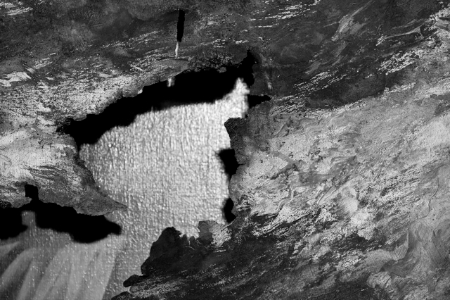Je suis donc plantée là, devant les douze images noir et blanc de Paulien Barbas, juxtaposées pour former une grande œuvre. J’y contemple les textures, les crevasses, les cratères. Cela m’évoque d’anciennes photographies de la lune comme celle de John William Draper qui, en 1839, captait pour la première fois les détails du satellite naturel - et en même temps la force qui engendre nos marées -, à travers un télescope sur un daguerréotype. C’est ce fragment de mon imaginaire qui me permet de connecter avec l’œuvre et d’y apercevoir des traces de pinceau. À ce moment, tout se rabat à la surface, l’image perd de sa profondeur de champ, mais le paysage dramatique est d’autant plus prégnant parce qu’il s’avance vers moi, se morcèle, se multiplie. Je quitte la petite salle en me retenant de lire le texte explicatif dans la boite de plexiglas. Je ne garderai pour l’instant que le souvenir qui émerge de l’aventure de mon regard.