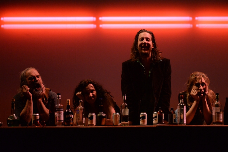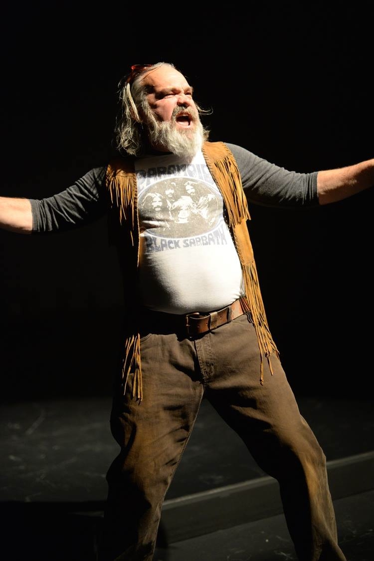 Ce premier monarque du récit immensément riche de Kemeid sera remplacé, sur le trône – simple chaise en bois légèrement capitonnée –, par les rois de feu (Henry IV, cousin de Richard) puis de fer (Henry V) dont les deux actes, dans la mise en scène de Frédéric Dubois, composent toute la deuxième partie du spectacle. Nous sommes en janvier 1972 lors de la prise de pouvoir de Henry Lancaster (Olivier Coyette), souverain dont les nombreux troubles de mémoire ne sont possiblement qu’une manifestation de cette modernité qui a voulu faire table rase du passé. Mais ce qu’on conservera de ce long tableau, ce n’est pas tant l’ambiance électrisante qui secoue Montréal – alors deuxième ville, après New York, du disco – dans ce bar faiblement éclairé de rouges néons, espace ivre qui n’est pas sans rappeler Bacchanale que les mêmes Kemeid et Dubois créaient en 2008 au Théâtre d’Aujourd’hui, c’est plutôt la longue tirade de Falstaff qu’incarne un Jean Marc Dalpé intensément débonnaire qui, fidèle à lui-même dans son jeu, et dans son chandail de Black Sabbath trop petit pour son gros ventre, interpelle le public à plusieurs reprises pour lui faire un pied de nez en bonne et due forme : « Pis toi là qui me regardes avec des yeux grand ouverts / Écoute-moi ben / Je marche à toi comme une truie assoiffée qui aurait écrasé toute sa portée sauf un / J’aimerais mieux me torcher avec toi que t’avoir comme spectateur / J’aimerais ça te flusher / Comme ça je vais pouvoir vider toutes mes canettes tranquille / Sans que j’aie à supporter ta présence / Sans que j’aie à te distraire / Sans que j’aie à te divertir. » Fin connaisseur de l’œuvre de Shakespeare – il a notamment traduit dernièrement le Richard III que Brigitte Haentjens présentait sur les planches du théâtre de tous les classiques –, Dalpé est également une figure de proue, depuis les sombres paysages de l’Ontario français des mêmes années que l’univers du Falstaff de Kemeid, d’une dramaturgie qui s’affirme et dont la vitalité dépend en grande partie de ceux qui s’y intéressent.
