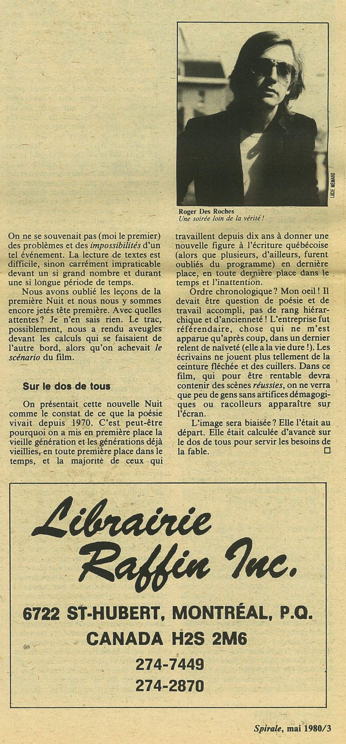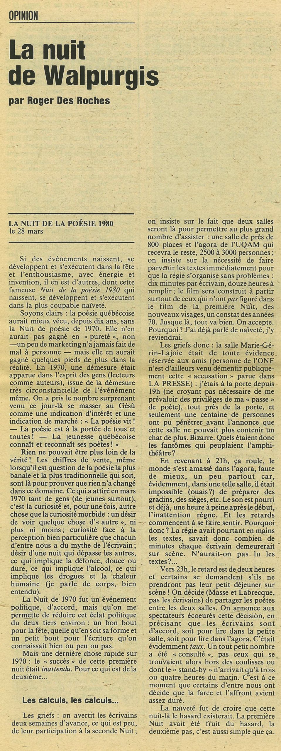 Cette semaine, on peut lire Roger Des Roches qui est ressorti amer de la Nuit de la poésie 1980 (il avait été de celle, proprement légendaire, de 1970, mais son passage, comme ceux de nombre d'autres poètes, n'avait pas été retenu au montage du film de Jean-Claude Labrecque) : «Nous avons oublié les leçons de la première Nuit et nous nous y sommes encore jetés tête première.»