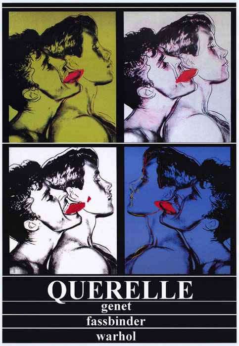 . Mise en valeur d’événements publics ou de politiciens, vente de produits, publicité pour des galeries et même promotion de causes sociales, Warhol n’écarte aucun domaine. Sa célébrité acquise comme personnalité publique lui amène plusieurs commandes à partir desquelles il explore la frontière entre design graphique, art visuel et publicité. Ainsi, l’association entre la sérialité de l’image, procédé cher à l’artiste, et la multiplicité de son support lui permet de créer des œuvres comme autant de variations sur le même thème. La série d’affiches réalisée pour Querelle de Rainer Werner Fassbinder en 1982 (non présentée dans l’exposition), la campagne de pub pour Levi’s ou encore celle pour Perrier jouent à merveille avec ce dispositif.