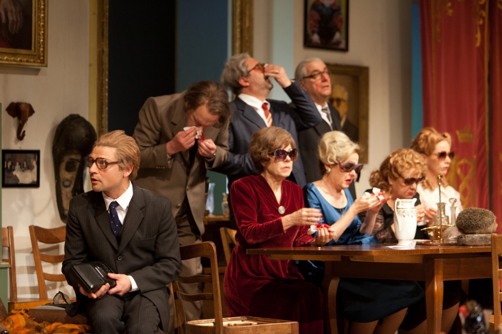 C’est à peu près là qu’on s’éloigne de Labiche : Christoph Marthaler – de concert avec le dramaturge Malte Ubenauf ainsi que la scénographe et costumière Anna Viebrock – a heureusement gommé le caractère extrêmement misogyne de la pièce (ce sont au départ les femmes qui sont la cause de tous ces grotesques sparages auxquels les hommes ne font qu’emboîter le pas), cela en mettant l’accent davantage sur la rencontre absurde de ces deux familles plutôt que sur leur tentative de se jeter de la poudre aux yeux.