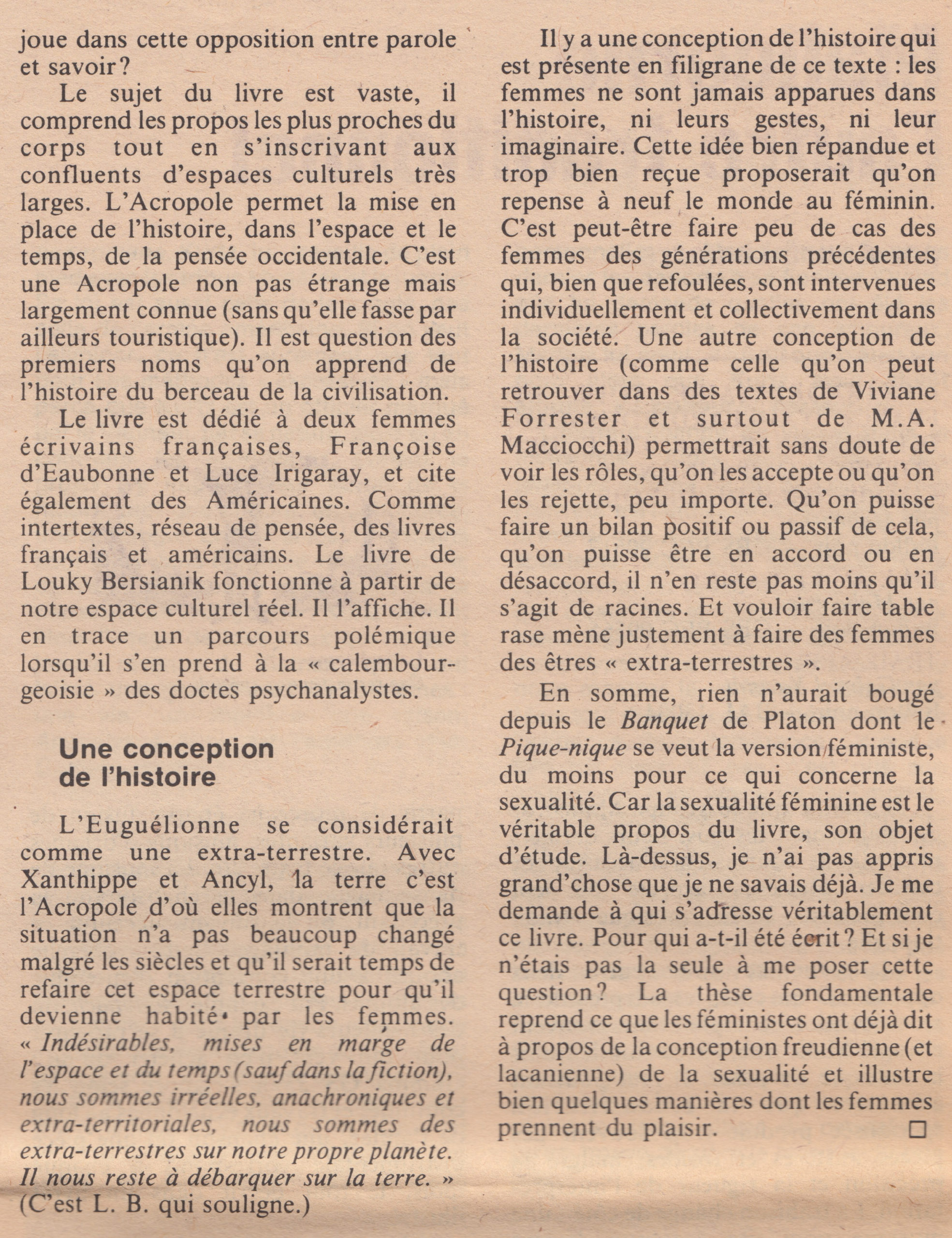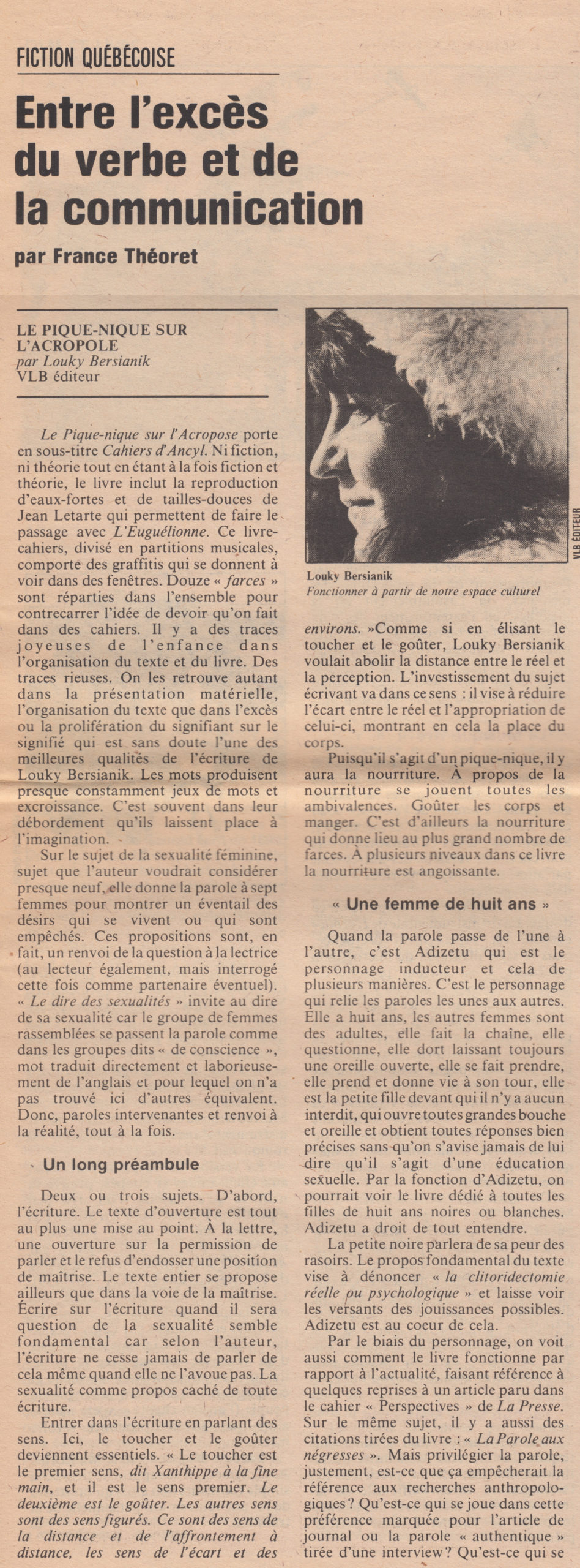 Pour cette édition de SPIRALE VINTAGE, nous profitons de l'hommage qui sera rendu, le 4 juin prochain, à France Théoret, cofondatrice du Magazine Spirale, pour la relire. En février 1980, elle signait une critique lumineuse de l'ouvrage Le pique-nique sur l'Acropole de l'incontournable Louky Bersianik.