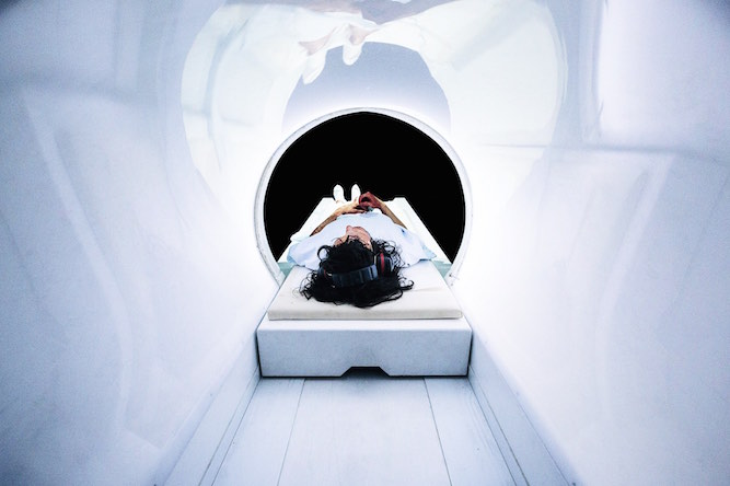 Castellucci joue d’ailleurs beaucoup avec les différents temps, allant d’un univers ultramoderne pratiquement désincarné à des scènes plus neutres. Dans le même ordre d’idées, lorsque la mère se voit forcée par les autorités de répondre de ses actes – afin de retrouver l’enfant et le sauver –, elle fera allusion à de nombreux éléments du récit de Moïse qui nous ramènent aux fondements de notre imaginaire judéo-chrétien, ce qui superpose en quelque sorte les temporalités. Le plus grand glissement en ce sens a cependant lieu à la toute fin du spectacle : après que la mère disparaît dans un appareil de résonance magnétique, on est propulsé dans une immense caverne du néolithique – je le déduis, puisque c’est à cette période qu’ont lieu les premiers rites funéraires – dans laquelle une femme, entourée de quatre autres de ses congénères, dépose en terre son enfant décédé avec comme seule stèle une vulgaire pierre, mère éplorée qui n’aura droit, comme seule consolation, qu’à un acte charnel qui viendra peut-être l’engrosser à nouveau.