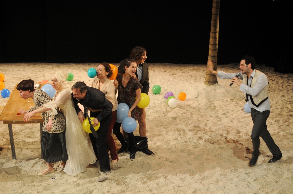 Une scène loufoque de mariage qui se termine en bonne engueulade : «Je t’ai échoué, je n’ai pas été capable de te distraire de toi, de ta propre médiocrité. Mais ce n’était pas mon rôle! Moi je t’aimais comme tu étais.» Un peu plus tard : «Je t’ai pas fait d’enfant, car tu ne l’aurais pas supporté, tu es incapable de te voir, imagine un gosse. Il n’y a pas assez de miroirs chez toi.» Le tout accompagné d’un pianiste barbant la foule et jouant Un homme heureux de William Sheller. Vous avez dit grotesque?