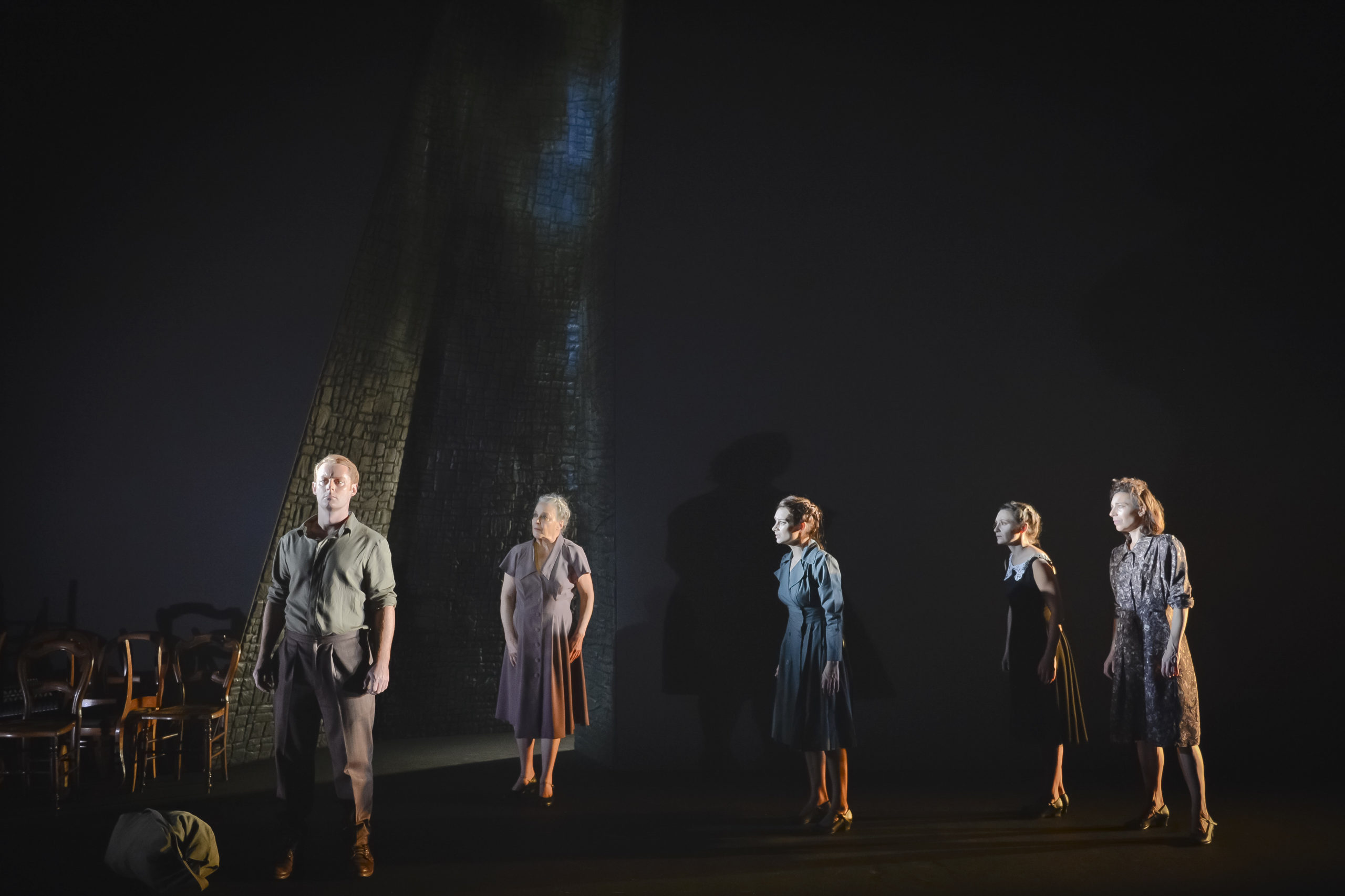 Loin d’être une transposition réaliste du texte, l’adaptation signée Jean Marc Dalpé — partenaire de création d’Haentjens depuis ses débuts au Théâtre du Nouvel-Ontario de Sudbury — répartit les mots entre quatre interprètes porteuses de différentes sensibilités. Elles s’avèrent néanmoins prisonnières d’une même condition, d’un même sabot, celui d’être femme en temps de guerre. Une condition que leurs chaussures identiques et leurs robes taillées à la même longueur, aident à rappeler.