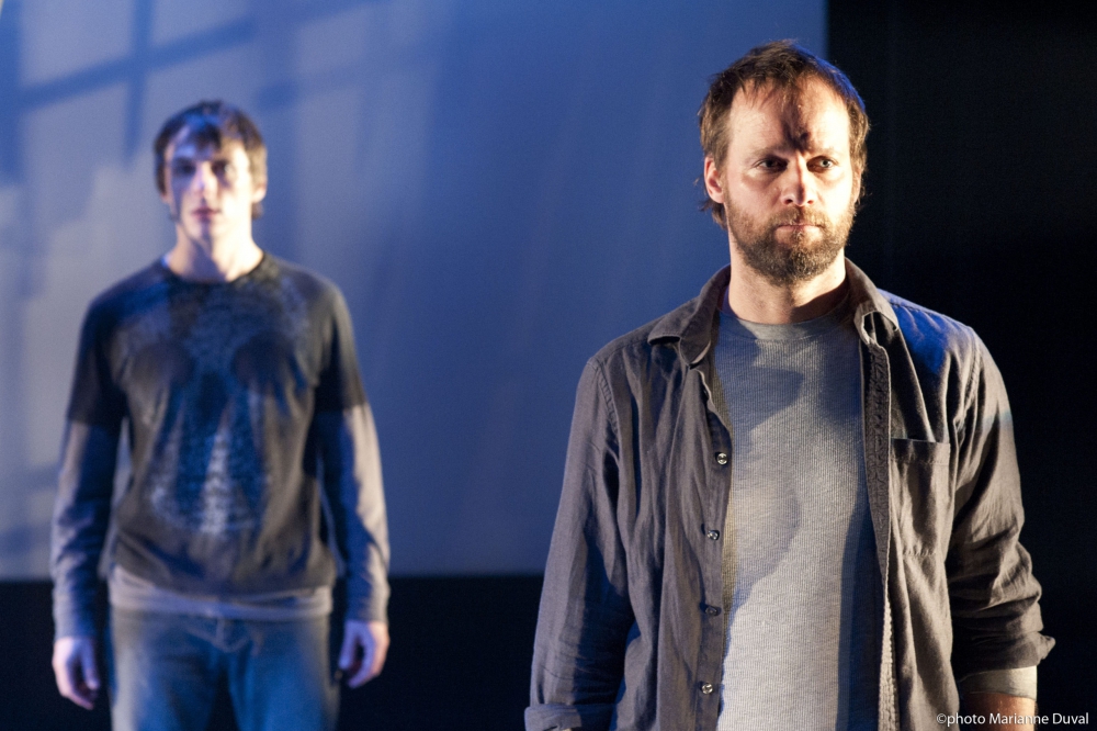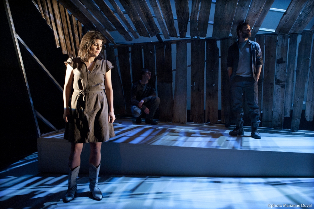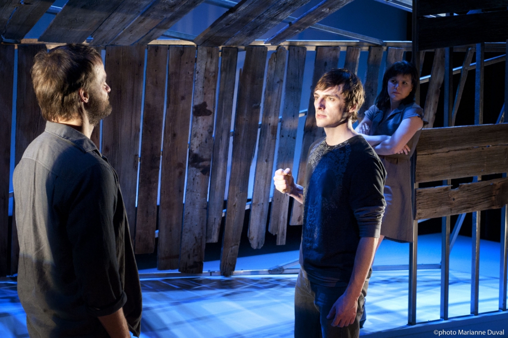 Sur scène, une reproduction d’une grange aux lattes de bois espacées pour jouer avec la lumière, installation à laquelle on peut s’accrocher, se pendre, sur laquelle on s’appuie ou se couche, bref où l’on peut tout faire et ne rien dire à la fois. Les scènes entrecoupées de chansons composées à partir des poèmes de Dalpé qui se trouvent dans le roman et qui rappellent un peu les textes de Lisa Leblanc ponctuent les révélations à la façon d’un téléroman.