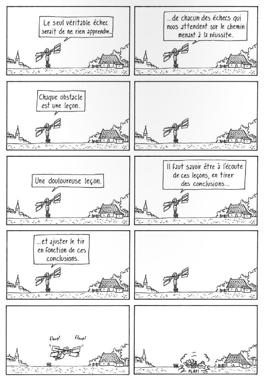 Si le caractère répétitif des échanges est en phase avec le thème de l’échec perpétuel et la constance du dessin, il est parfois lassant à lire ; surtout dans le chapitre 2, de loin le moins réussi avec ses aviateurs transformés en pénibles douchebags. Mais Les premiers aviateurs reprend rapidement son envol dans le chapitre 3, carrément jouissif.
