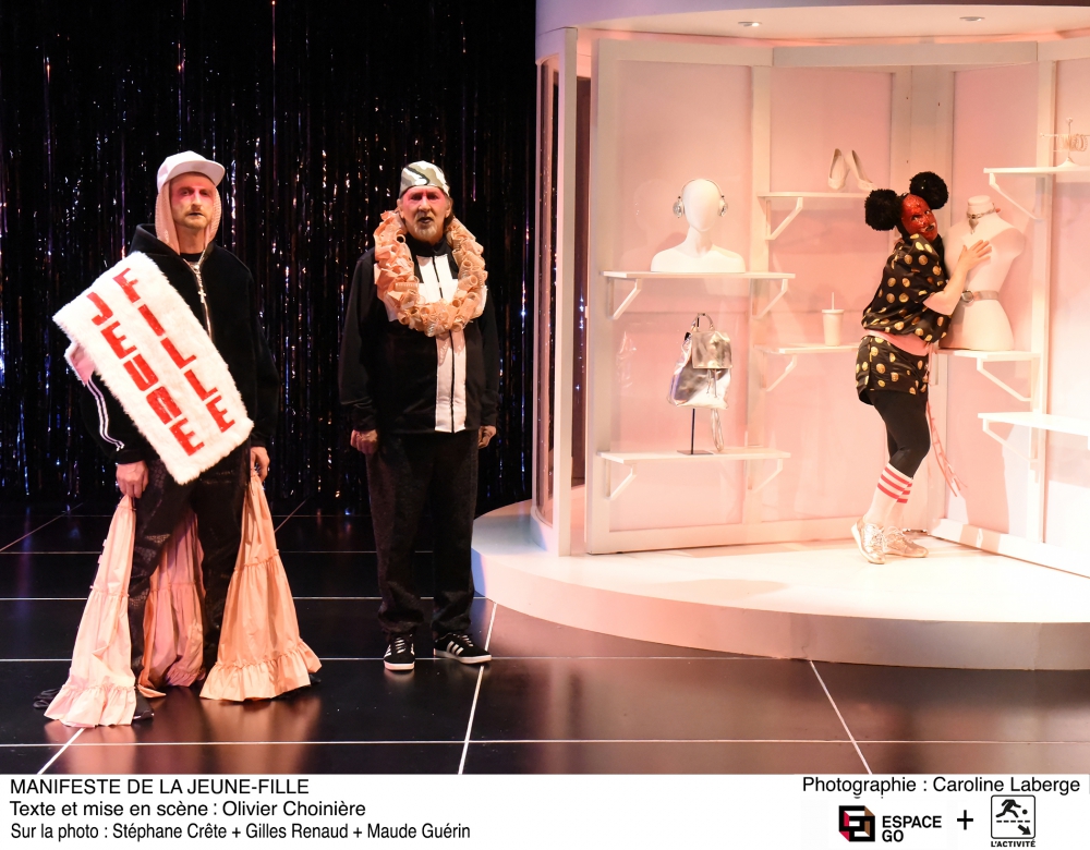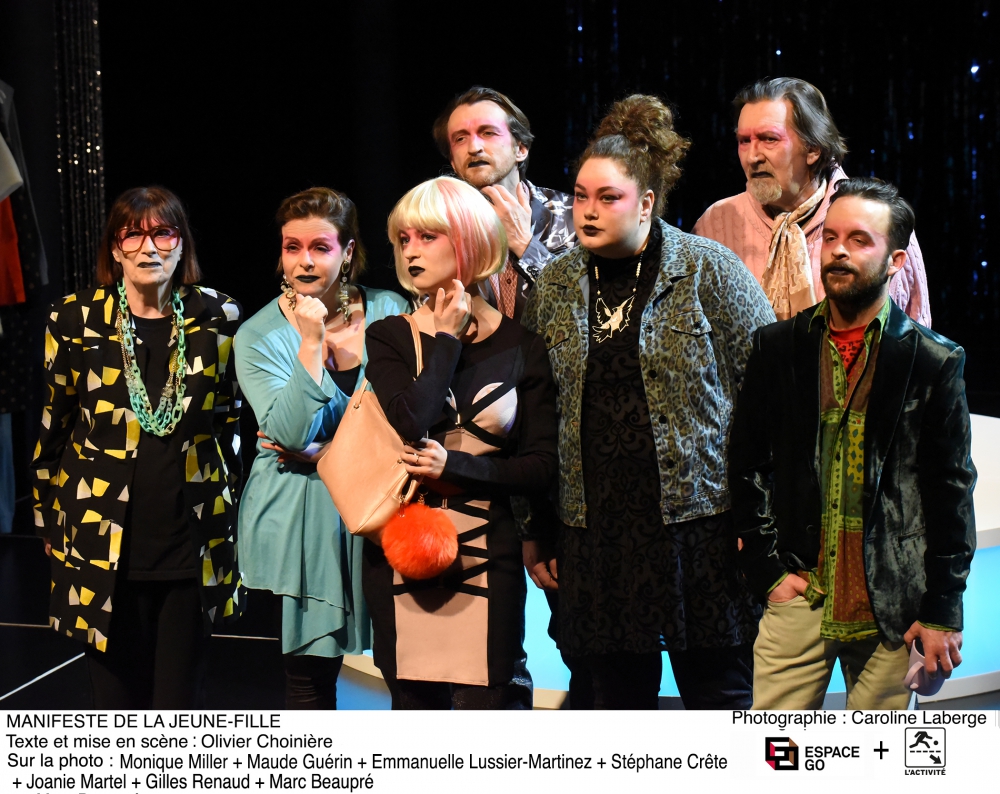 Manifeste de la Jeune-Fille, une coproduction Espace GO et L'activité; texte et mise en scène : Olivier Choinière; avec Marc Beaupré, Stéphane Crête, Maude Guérin, Emmanuelle Lussier-Martinez, Joanie Martel, Monique Miller et Gilles Renaud; présenté au Théâtre Espace Go, du 24 janvier au 18 février 2017.