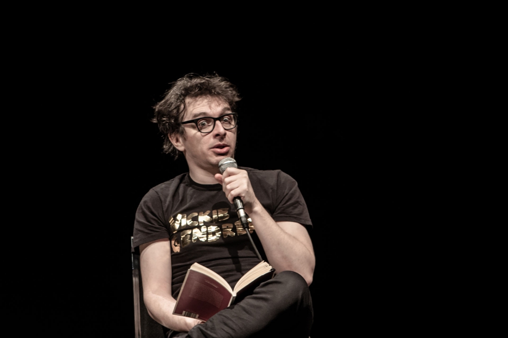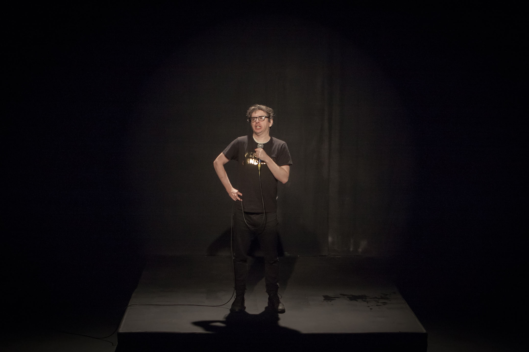La vie littéraire n’est pas une récitation, mais bien une parole dont il faut faire l’expérience. Le spectacle mise sur un dépouillement scénique pour s’organiser autour du corps en scène d’Arsenault. Présentée comme un stand-up, l’œuvre emprunte à l’imagerie du spectacle d’humour à l’américaine : l’espace scénique est réduit de moitié par un rideau noir devant lequel se trouve une petite estrade. Armé d’un micro à fil, éclairé par un spot (assez puissant pour laisser les spectateurs dans une demi-obscurité), debout sur son estrade dont il ne bougera pas d’un iota pendant environ 45 minutes, Arsenault habite son texte avec un aplomb surprenant.