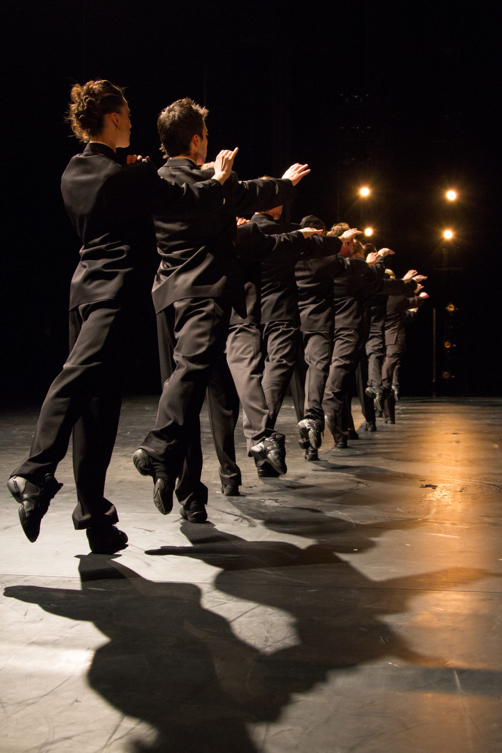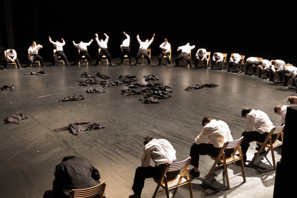 Nombreux sont les tableaux de groupe réunissant les 26 interprètes sur scène. Ces révolutions chorégraphiées par Ohad Naharin sont sa signature, celle d’une danse politisée. Minus One ouvre avec la phrase suivante : « L’illusion de la beauté et un mince fil qui sépare la folie de la raison, la panique derrière le rire et la coexistence de la fatigue et de l’élégance… » Les lumières s’allument, les danseurs portent des costumes noirs sur leurs chemises blanches, des souliers et des chapeaux noirs, ils sont assis sur des chaises en bois et forment un arc de cercle parsemant la scène. Les tambours résonnent, c’est le début de « Echad Mi Yodea », chant traditionnel juif israélien qui retentira durant sept minutes et remplira le Théâtre de Maisonneuve pour bien débuter.