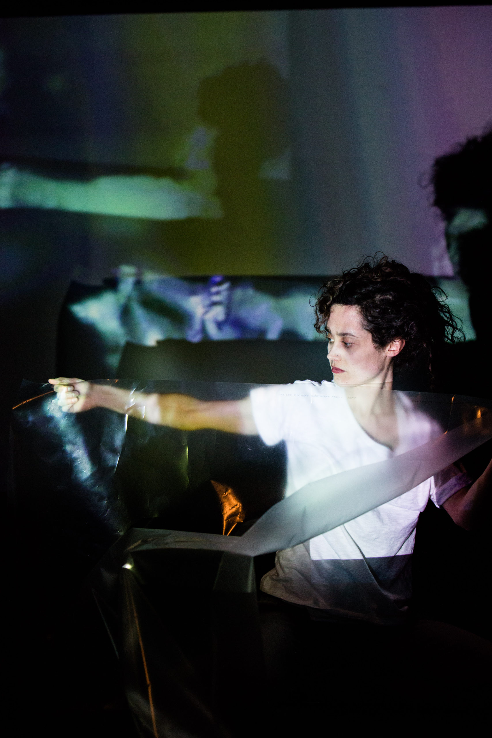 Closer de Karen Fennell est une étude plus qu’une œuvre, dont le titre explicite dit l’intention : faire comprendre, faire entendre, faire voir le corps de plus en plus près. La vidéo et la trame sonore live, manipulées par Nikki Forrest, sous un son envahissant, monotone et tenu, captent les vibrations et démultiplient les corps sur un écran miroir, où les images brouillées entrent en une chaotique succession. On restera intrigué par le rôle du ventilateur dans l’aire duquel la danseuse semble s’épanouir. Tout lui fait scène, surtout un morceau de plastique transparent, froissé et bruitant, dans lequel elle se roule et rampe au sol. Toute cette peau lui est matrice, matériau premier d’un contact élémentaire. Une scène originelle paraît vouloir se dessiner. La chrysalide cherche à se déployer. Des yeux brillants trouent l’espace, par un jeu de regards intenses.