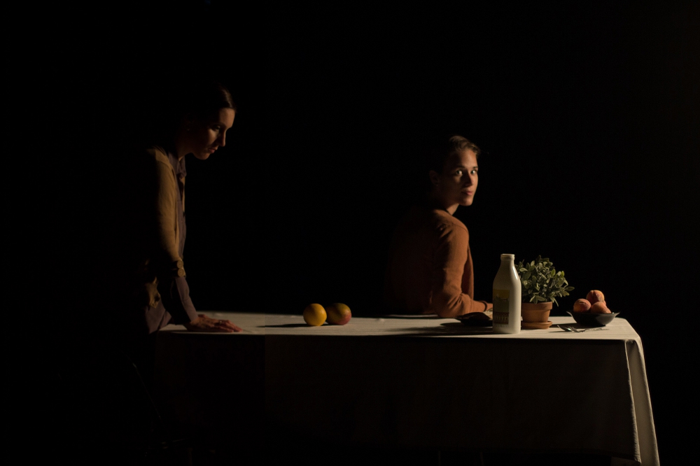 Habiter de Katia-Marie Germain est une belle suite de tableaux immobiles, dont l’esthétique est celle des natures mortes classiques, du moins telle est la table à dessert autour de laquelle sont assises ou debout deux personnages. D’elles, voici les portraits paisibles, figés et colorés de Georges de La Tour, à qui on aurait prêté la mélancolie des toiles de Edward Hopper : Katia-Marie Germain et Marie-Gabrielle Ménard, ces deux jeunes filles aux traits superbement dessinés, prêtent leurs profils, attitudes, moues, regards perdus à une succession de tableaux qui, lors du passage au noir, montrent que la femme a changé de pose ou déplacé sans bruit sa chaise ou un menu objet déposé sur la table.