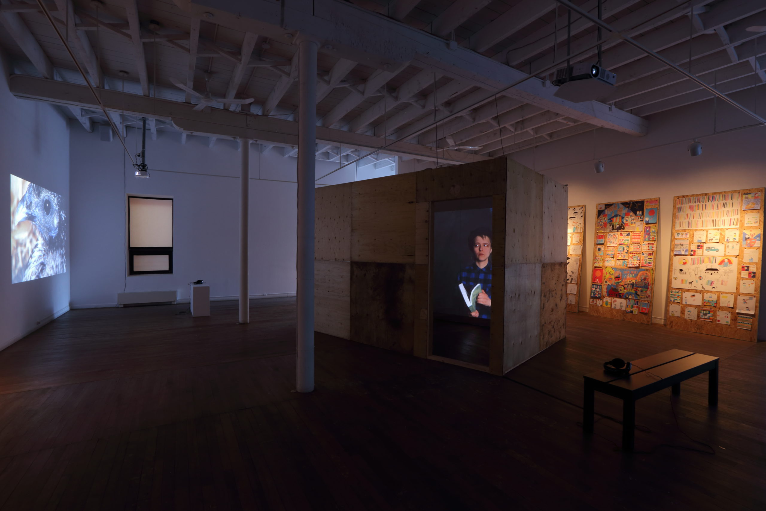 Bien que les projections vidéo occupent une grande partie de l’espace, Kielhofner présente aussi une série de dessins affichés au mur ainsi qu’un livre d’artiste à consulter sur place. En dialogue avec les projections, ces supports offrent une forme condensée de l’histoire et cristallisent les thématiques explorées. De facture à la fois enfantine et très étudiée, les dessins sont disposés les uns à côtés des autres, de manières à créer de petites scènes statiques. Le spectateur reconnaît non seulement les sujets présents dans les vidéos, mais aussi les processus de juxtaposition d’images qui font partie du montage. Cet intérêt de l’artiste pour le support papier se reflète dans les projections où l’acte d’écrire est représenté, où des livres sont montrés, où les bruits de papier froissé, manipulé abondent. La représentation de l’écrit renvoie sans cesse à l’acte même de raconter une histoire et installe de surcroit une distance qui augmente l’aspect fictionnel de l’œuvre.