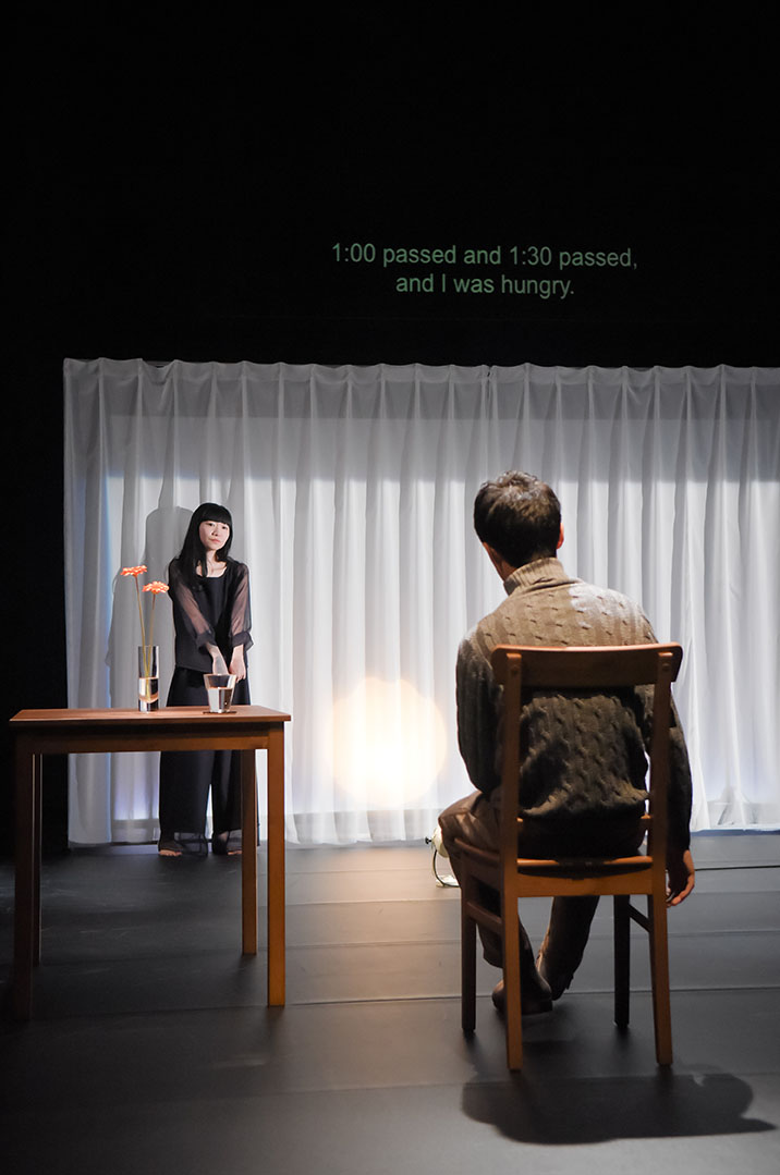 Un peu à la façon d’un En attendant Godot de Beckett, ou encore de Quelqu’un va venir de Fosse, Time’s Journey Through a Room d’Okada use du même dispositif, celui d’une tierce partie qui viendra – ou pas – bouleverser un sensible ordre établi. Ici, le titre de l’œuvre fait foi de tout : le temps et l’espace sont au cœur de la proposition théâtrale, tandis que le spectateur se retrouvera toujours pris en deux temporalités, voire deux réalités, desquelles il devra extraire l’essence des silences.