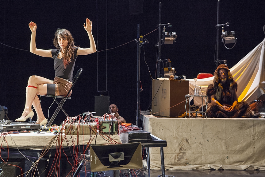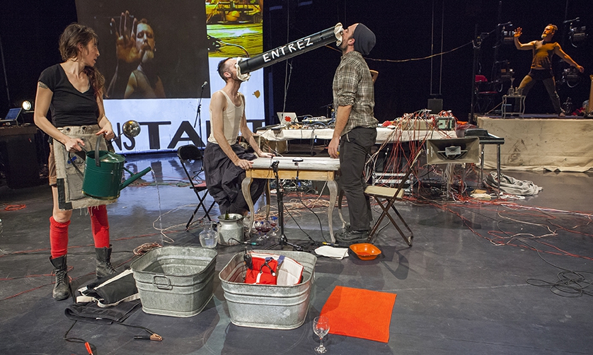 Le titre, véritable invitation à « entrer dedans » pour partager un espace et un imaginaire, témoigne d’une ouverture du Bureau envers son public, toujours mis à contribution (la salle est d’ailleurs généralement illuminée par un éclairage plein feu). À l’image des choses, le spectateur a tout le loisir de se « connecter/déconnecter » durant les différents moments de la pièce. (Il est d’ailleurs assez fascinant d’observer le public, entre ceux qui quittent parce que dépassés par la proposition déconcertante du Bureau de l’APA et ceux qui se soulèvent de leur siège pour mieux voir le bidouillage qui se fait en avant-scène.) Mais ce n’est peut-être pas étonnant : après tout, le chaos suppose une part d’instabilité, de manque de contrôle, et Entrez, nous sommes ouverts souffre d’une construction par parties qui ne sont pas toutes égales entre elles.