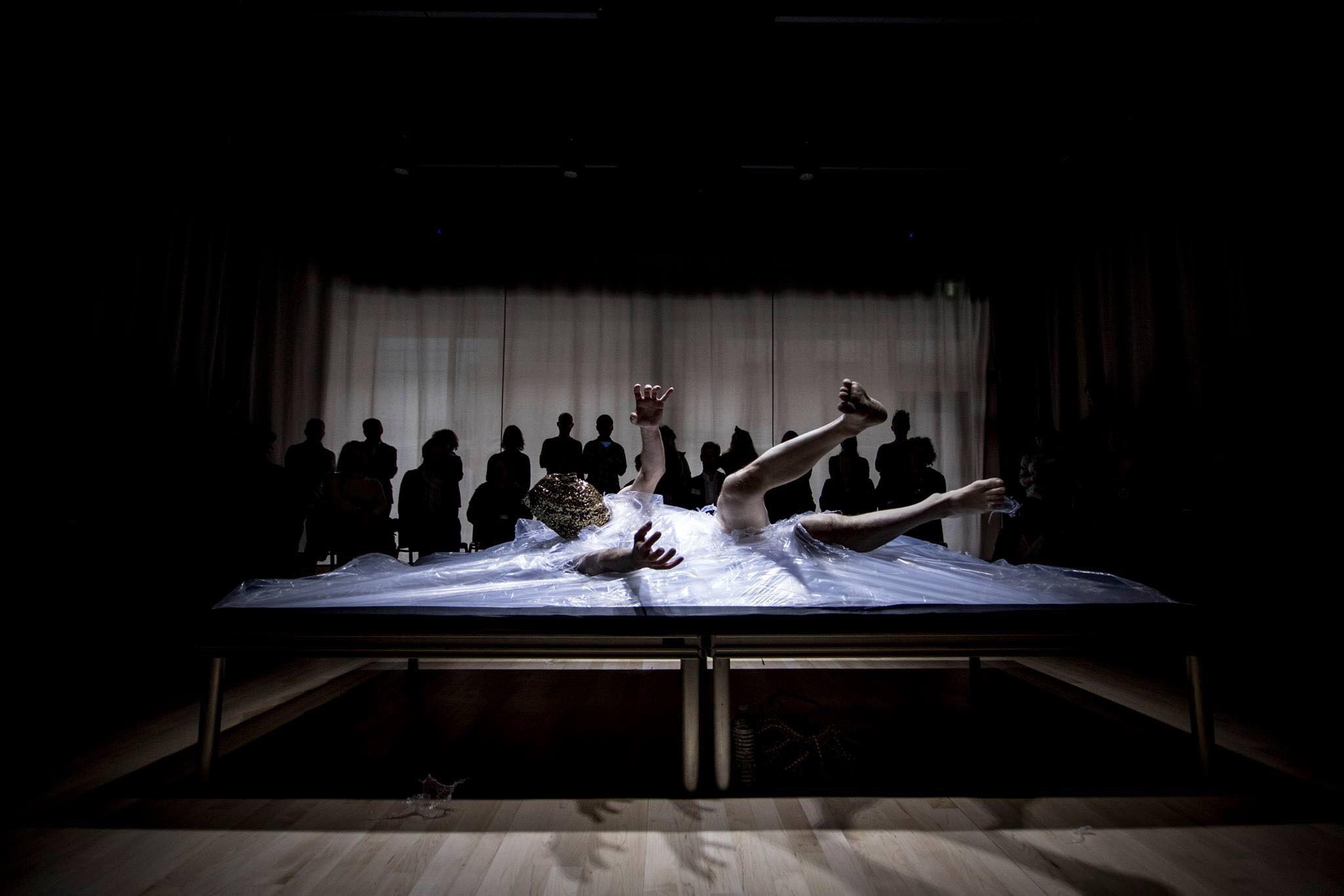 Un néon jaune s’allume sur scène tandis que St-Pierre fœtus se réveille dans son plastique. Prisonnier, recroquevillé, il tente de le déchirer. La violence de ce tableau est accentuée par le bruit de la matière qui crisse sous les membres de St-Pierre. Il réussit à passer un pied au travers, un mollet, puis deux doigts, une main, un avant-bras avant de sortir un puis deux bras, une puis deux jambes. Toujours prisonnier de ces minces ouvertures, une bouche, suivie d’un visage, apparaissent finalement à la surface. Seule sa tête masquée et ses quatre membres dépassent. Tel un papillon qui sortirait de son cocon, St-Pierre se cambre, respire fort et promène la table à travers l’espace scénique. Enfin libre, il renaît.