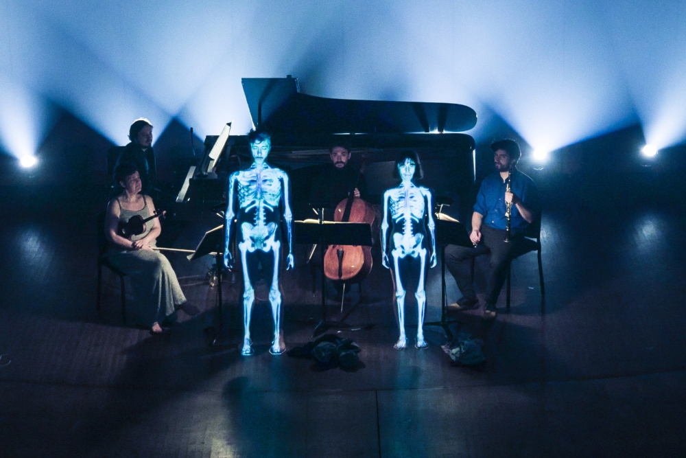 La musique est plus lente pour permettre aux acteurs de la pièce de sortir en attendant la fin. Une fin du Temps à l’image d’une apocalypse contemporaine dans laquelle la note finale de la composition persiste jusqu’à ce que tout et tout le monde disparaisse. Musiciens, interprètes, corps nus, projections, lumière, puis finalement, la musique.