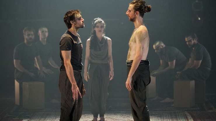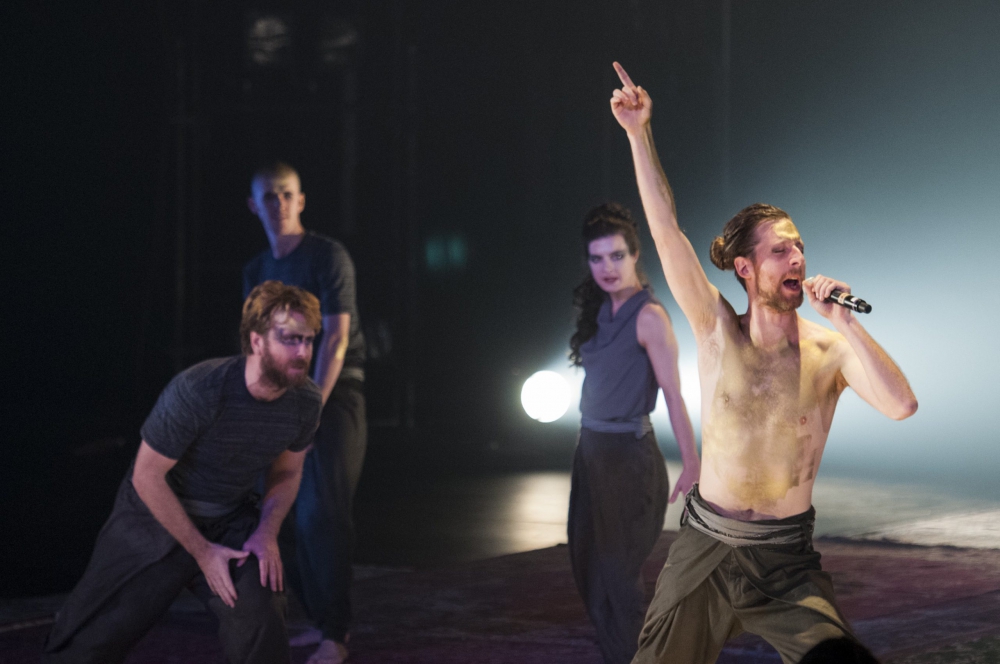 À la différence, cette fois, que le parti-pris vocal de Beaupré est en rupture flagrante avec les attentes spectaculaires qu’une adaptation de L’Iliade pouvait créer, avec tout ce que le texte suppose de batailles violentes et meurtrières ; les spectacles précédents s’échafaudaient sur des textes (Caligula_remix, Dom Juan_uncensored et Hamlet_director’s cut) qui reposent sur une violence plus intime, contrairement au grand déploiement qu’on s’imagine à la mention du poème homérique. L’Iliade donne aussi à Beaupré l’occasion d’amplifier son exploration vocale avec une musique live (composée et jouée par Stéfan Boucher et Olivier Landry-Gagnon, mais aussi par Maya Kuroki et les autres comédiens, qui amplifient le texte à coups d’instruments percussifs).