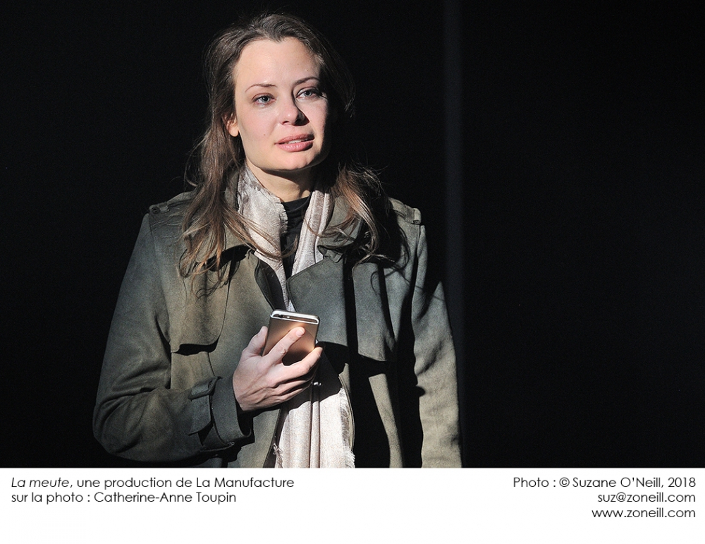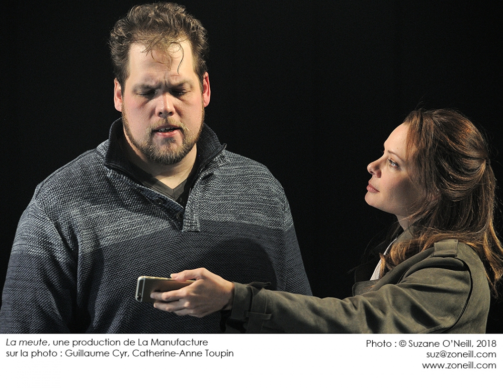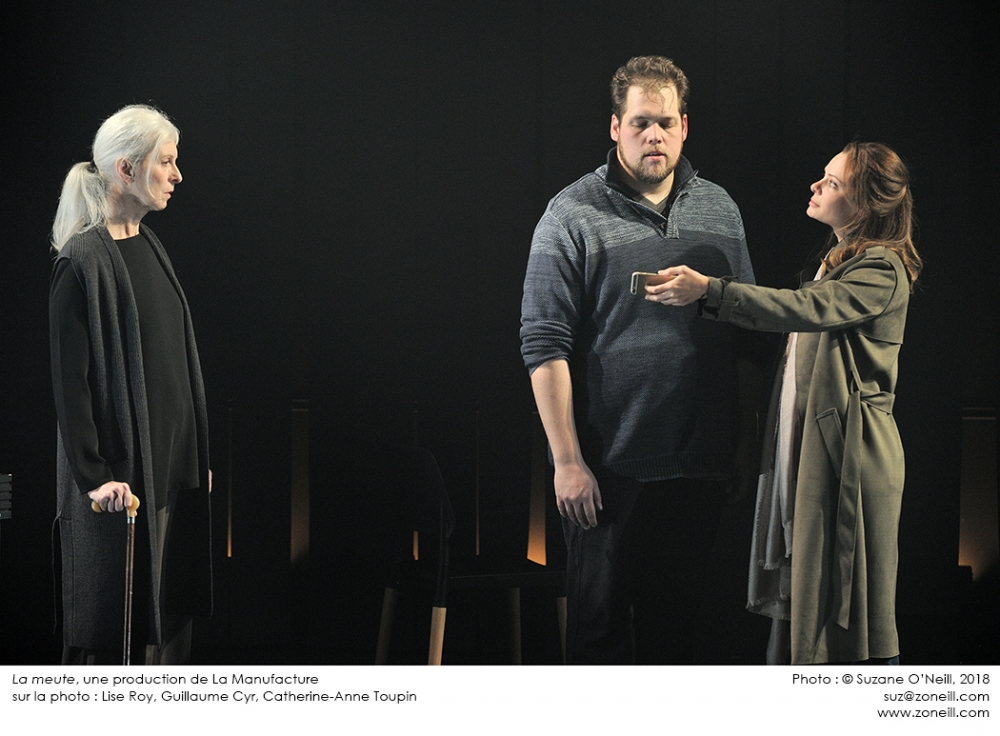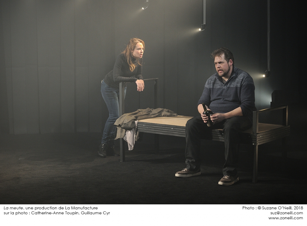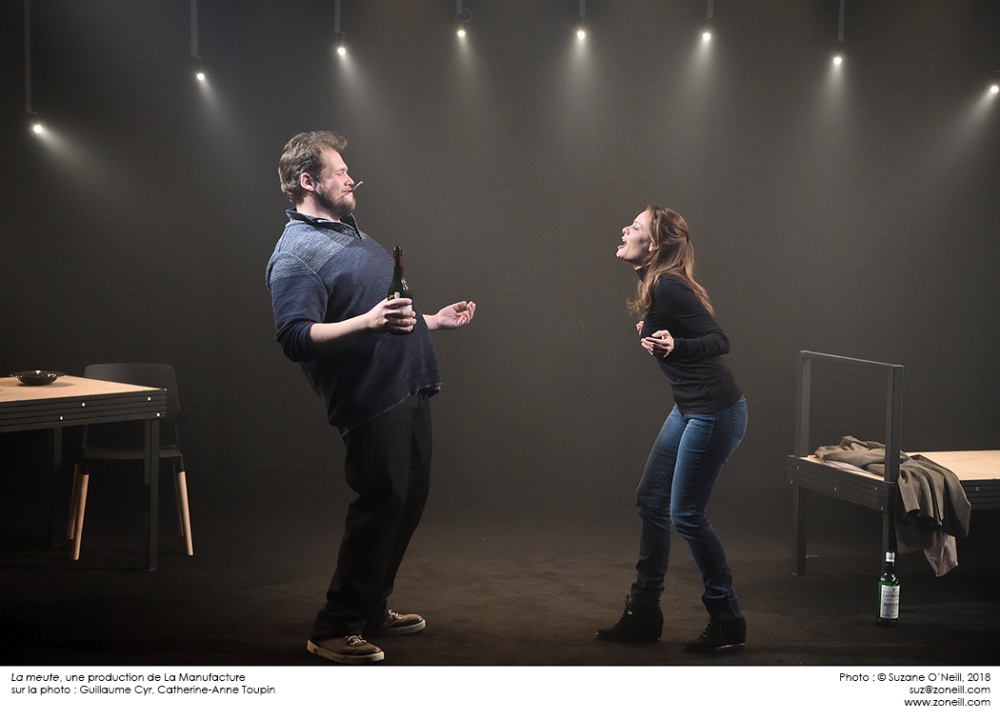 La meute, un texte de Catherine-Anne Toupin, mise en scène par Marc Beaupré, avec Guillaume Cyr, Lise Roy et Catherine-Anne Toupin. Une production du théâtre de La Manufacture. Au théâtre La Licorne (Montréal) jusqu'au 17 février 2018.