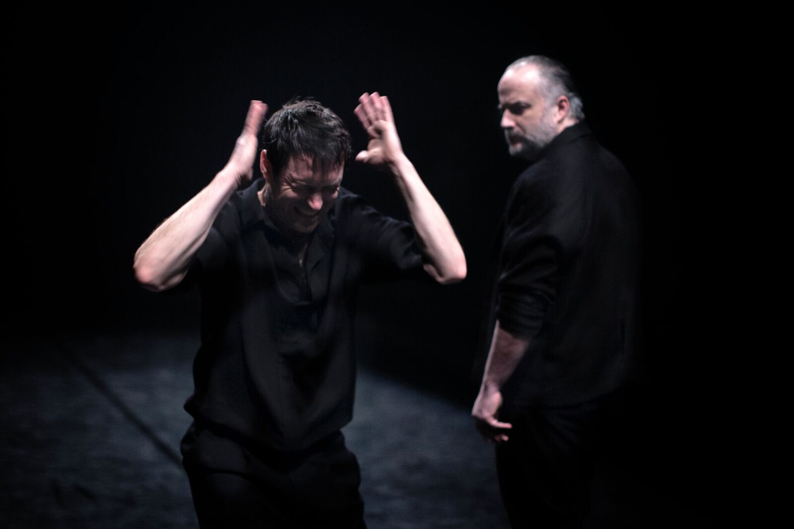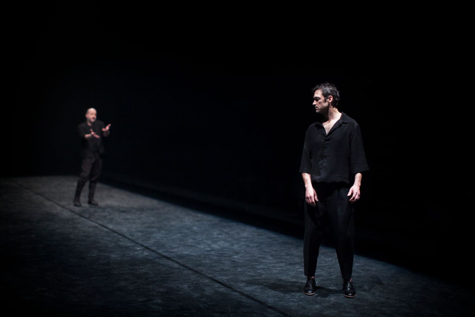 Ce chassé-croisé prend la forme de trente-six tirades à durée longue, demandant aux acteurs de maitriser à la perfection un texte dont l’exigence ne pardonne aucun raté. Car ici, de la phrase à l’action, il n’y qu’un pas à franchir. Celui de l’énonciation, que la mise en scène d’Haentjens porte précautionneusement en évitant tout élément de décor et en proposant en revanche une scène axiale en arène, bordée d’estrades, de façon à reproduire la binarité formelle de l’échange entre les deux personnages à l’échelle des spectateurs. La scène rectangulaire se présente, pour ainsi dire, telle une pliure entre les spectateurs. S’ils font face à une part de l’audience, ils tournent le dos à l’autre. Cette configuration embrasse l’hermétisme de l’échange : aucun aparté vers le spectateur, la mise en scène jouant avec la contrainte de la longueur de la scène à dessein en resserrant la tension de cet espace partagé.