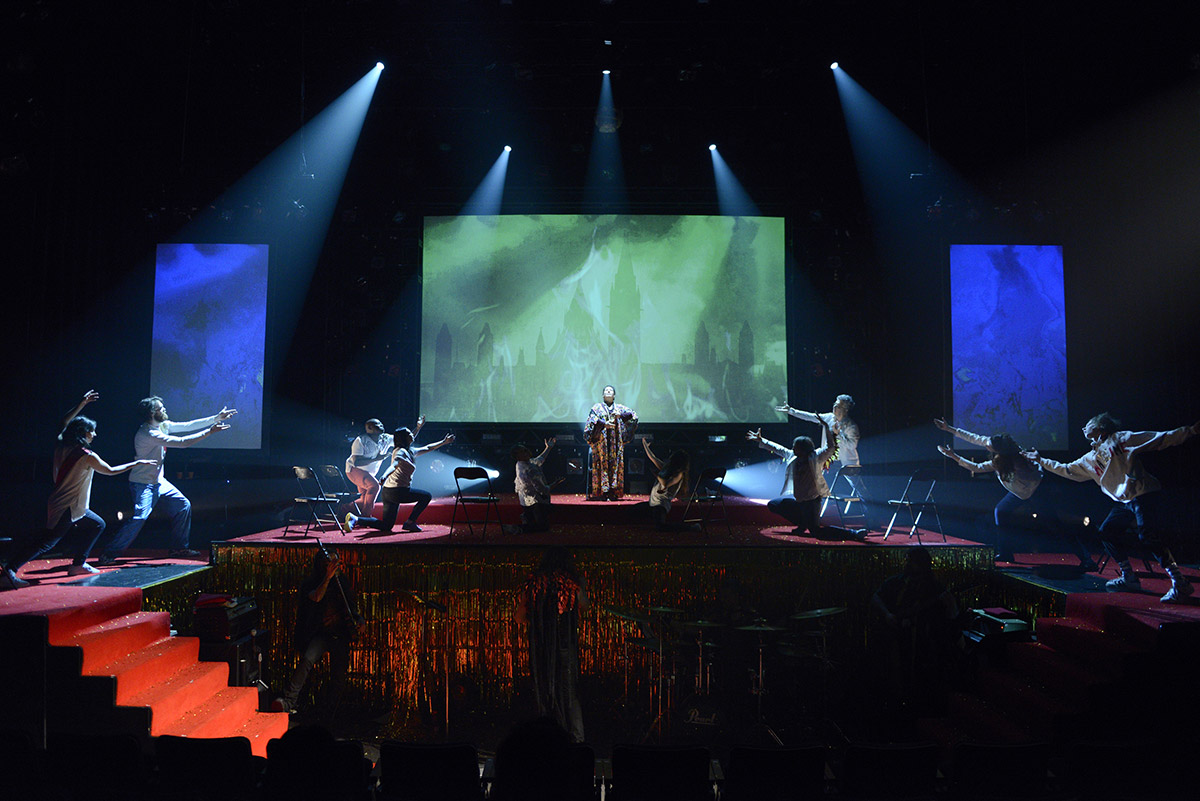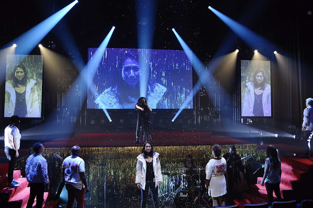 Jean dit ne manque jamais l’occasion de rappeler au spectateur qu’il se trouve devant un spectacle : ainsi des comédiens, assis sur les côtés, qui sourient et acquiescent aux discours prononcés sur scène, mais qui « incarnent » les personnages dès qu’ils entrent dans l’aire de jeu. Dans la même veine, chaque nouvelle confession (qui prend la forme d’une promesse à dire toute la vérité et rien que la vérité) se conclut par de fausses larmes (en maquillage gris plein de glitter) posées sur le visage du repentant par un des membres du groupe. Paillettes gold sur le bord de la scène, organes géants peints en or (le cœur, des spermatozoïdes, un œil et une cage thoracique) et accrochés aux murs à côté des sièges, projections vidéo exagérément « metal » (on ne compte plus, sur les trois écrans situés en fond de scène, les décors qui explosent, se consument par des flammes ou sont agrémentés d’éclairs), tout signale l’ironie outrancière et donne à l’ensemble l’allure d’un gala cheap, tapis rouge et animateurs de foule en prime.