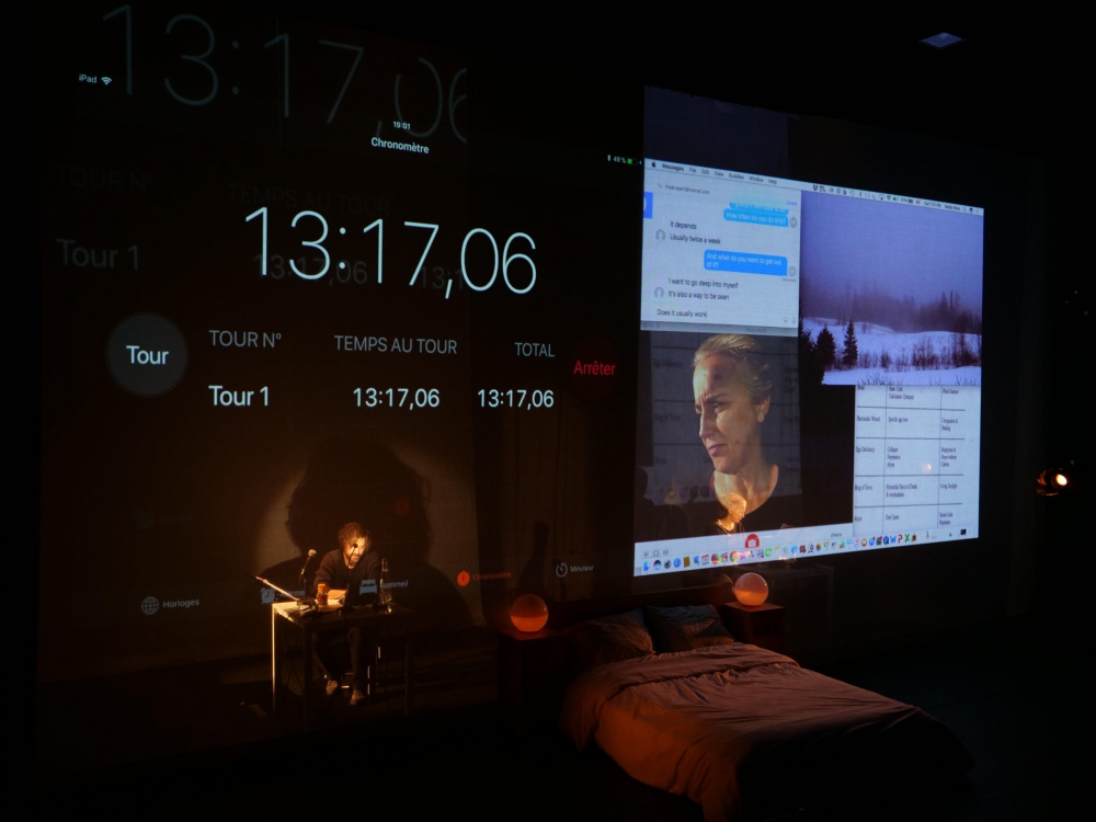 Faire du théâtre à partir d’une conversation sur Internet représente un défi certain, tout comme le fait de rendre dynamique pour le spectateur le jeu des recherches et des clics successifs qui peut sembler banal à celui qui s’y adonne quotidiennement, étant donné qu’il produit un matériau assez statique d’un point de vue scénographique. Le dispositif parvient néanmoins à capter notre attention, tout comme le rythme rapide auquel les pièces musicales sélectionnées à même YouTube (y compris Shape of you d’Ed Sheeran (!), dont le caractère explicite est d’autant plus frappant dans ce cadre) se succèdent. L’indétermination quant à la teneur exacte de l’échange — est-il bien question de sexe ? —, grâce à laquelle le texte prend de multiples résonances, contribue également à maintenir notre intérêt.