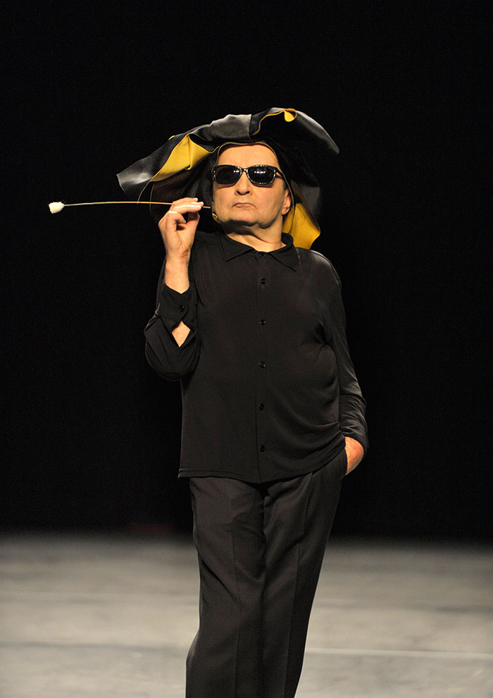 Pure oreille musicale, captif de l’art de la présence à l’autre danseur, dans le grand silence cérémonial qu’il orchestre, il écoute. Être singulier, il est l’homme des solos qu’il sait conjuguer : tel se présente Raimund Hoghe dans son Pas de deux, maître de la dignité et de l’intégrité, tout de noir vêtu, droit sur ses geta japonaises, ces sandales de bois qu’il porte en faisant de tout petits pas tronqués.