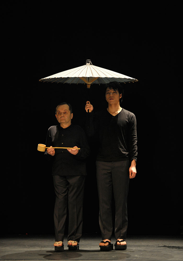 Faisant danser Takashi Ueno, Hoghe le met en lumière. La lenteur et l’immobilité vont compter davantage que les sauts carpés et la danse un instant frénétique du Japonais, plus encore que la danse des mains et autres gestes élégants accomplis de pair par Hoghe. Les accessoires scéniques – deux ceintures nipponnes, une pipe, un gobelet - seront détournés, objets ludiques signant des pauses symboliques données à ressentir dans la durée.