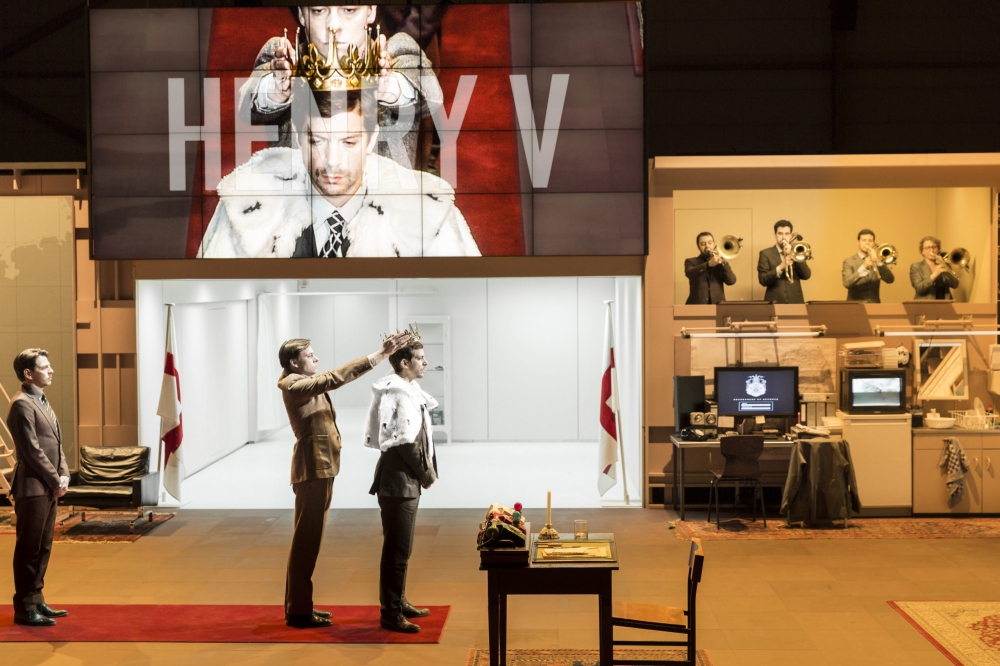 La scène présente une War Room dont les constants changements suivent le rythme des couronnements et des destitutions. Trois entrées débouchent sur cette vaste salle, qui dissimule derrière elle un corridor en U caché au public où se jouent plusieurs tractations politiques et encore plus de trahisons familiales. C’est à l’écran qu’est projetée l’action qui s’y déroule, poursuivie par un caméraman qui permet de jouer sur les angles morts de la brillante disposition scénique signée par Jan Versweyveld. Si l’intégration des technologies est risquée et trop souvent futile, ce qui épate ici est l’incroyable cohérence entre les dispositifs scéniques et les moyens auxquels Van Hove a eu recours pour les exploiter : ainsi rien d’inutile ne se retrouve sur l’imposante scène. L’ajout dans la distribution du contreténor Steve Dugardin ainsi que du quatuor de cuivre BL!NDMAN parvient à enrober la représentation d’une inquiétante intemporalité, soulignant ainsi à traits fins son actualité.
