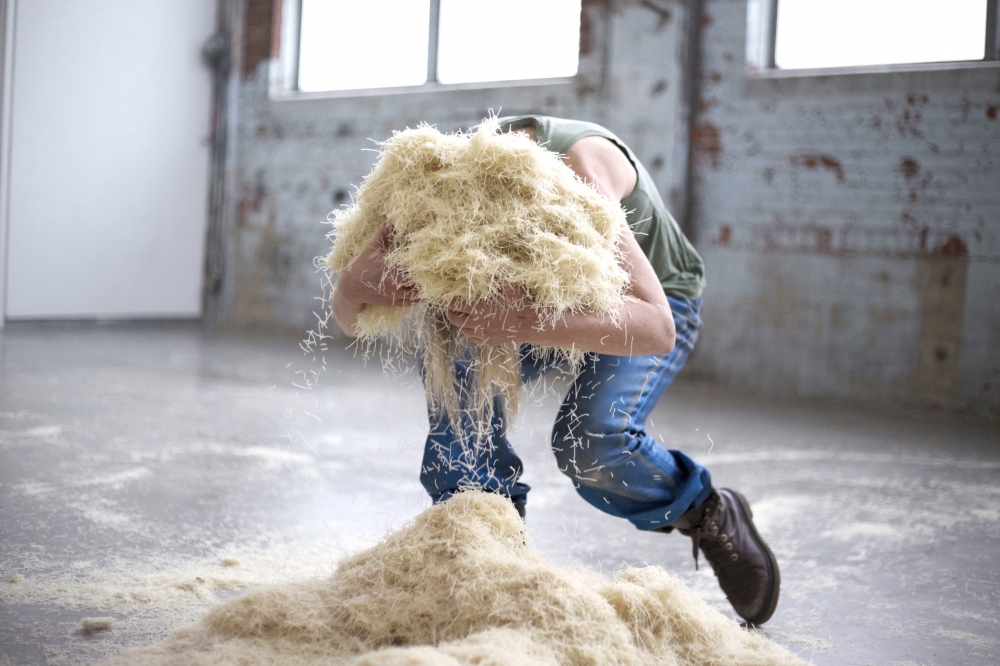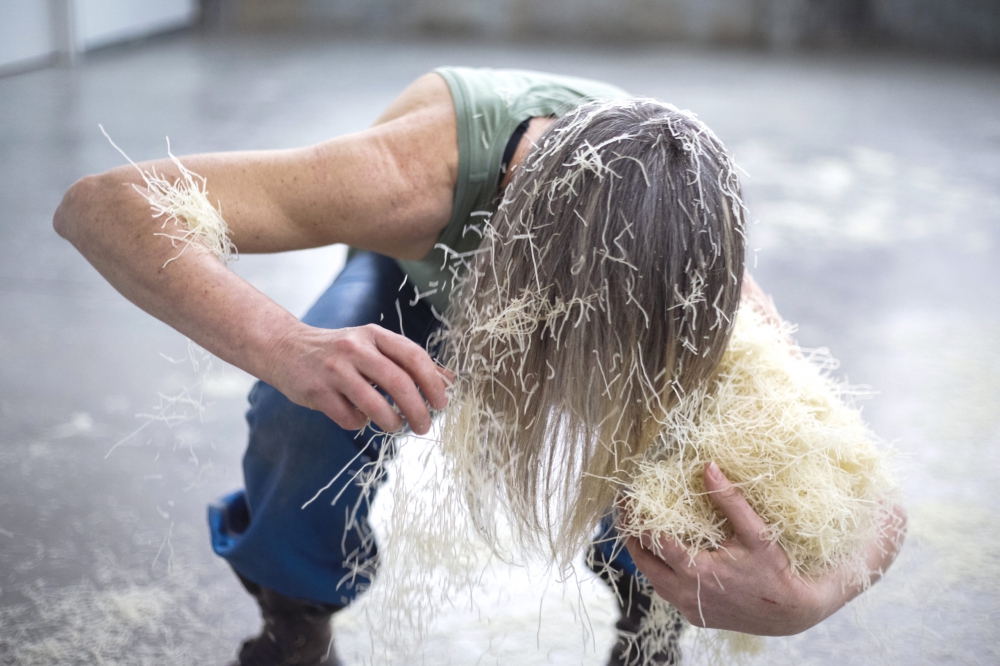 Concentrée et légère, Sophie Corriveau se promène à travers son œuvre comme une artiste de land art enfermée. Elle arrange le monde selon un ordre qui lui est propre. C’est par cette organisation du terrain que s’ouvre un accès à son monde intérieur, reporté au sein de son œuvre. Soudain, elle pose le pied sur un moulin électrique, entreprend de moudre les nouilles. Non seulement le son de cette machine à moudre participe à l’accumulation d’effets sonores dérangeants mais le résultat ajoute aussi au paysage. Cette fine poudre transforme une fois de plus la matière en un panorama nouveau, ouvre une probabilité infinie de potentialités, décuplant ainsi les possibles états du corps. Le sens se transmet ici à travers les sensations provoquées par la texture et le bruit des pâtes, craquées, broyées sous le corps, et par la transe envoûtante de l’interprète, qui altère nécessairement les consciences et l’univers perceptible de quiconque observe le jeu.