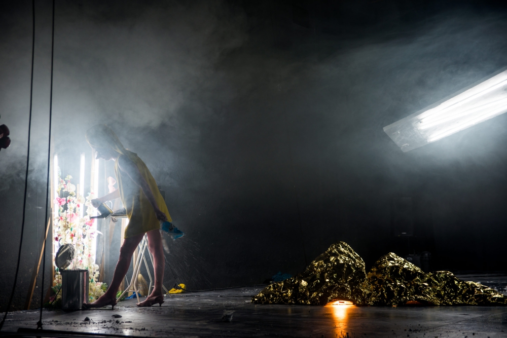 L’univers imaginé par Laskaridis est tour à tour inquiétant et ludique (les deux s’enchaînant comme un ballet sans fin), marqué par l’usage d’objets banals (fer à repasser, séchoir, scie, walkie-talkies), mais dont la logique reste toujours celle du chaos. Même le Titan Rose, pourtant au départ associé à la création, s’emportera à quelques reprises pour détruire ce qui était construit et recommencer de plus belle. Le spectacle, visuellement très riche, multiplie également les emprunts et les références artistiques. Ici, la posture du Titan Rose rappellera la peinture du Moyen Âge, avec ses arrière-plans dorés ; là, la musique du film Hunger Games sera l’annonce d’un dérèglement complet dans l’organisation (toujours chaotique) de l’espace scénique.