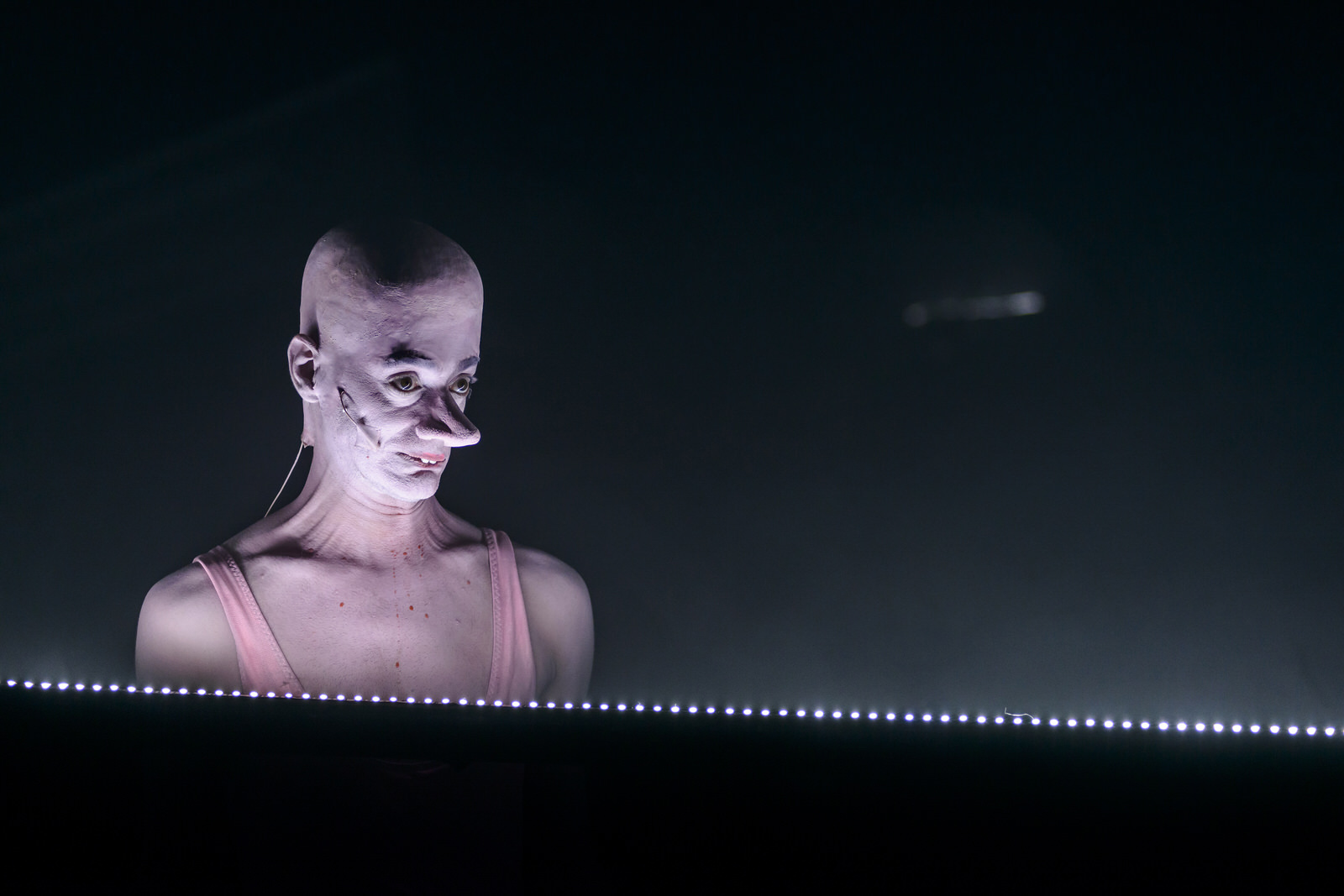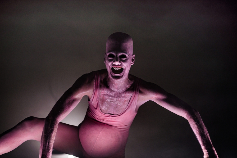 Deux créatures sont présentes sur scène. L’une, le Titan Rose, vêtue d’un justaucorps rose, portant des talons et une perruque, est une créature enceinte au nez énorme ; l’autre, l’Ombre (on me pardonnera le manque d’originalité, mais il faut bien essayer de les nommer), est tout de noir vêtu. Il porte un masque qui rappelle les collants que portent dans certains films les voleurs pour dissimuler leurs traits. Laskaridis utilise tous les moyens possibles pour déformer/reformer les corps en scène : travestissement, masques, faux ventre, voix modifiées, etc. Il s’agit bien de créatures hybrides, jusque dans leur comportement : mi êtres tout-puissants, mi enfants qui découvrent le monde (à plusieurs moments, l’émerveillement du Titan Rose rappelle celui des enfants qui goûtent les joies du jeu et de l’imagination) et l’étendue de leur puissance.