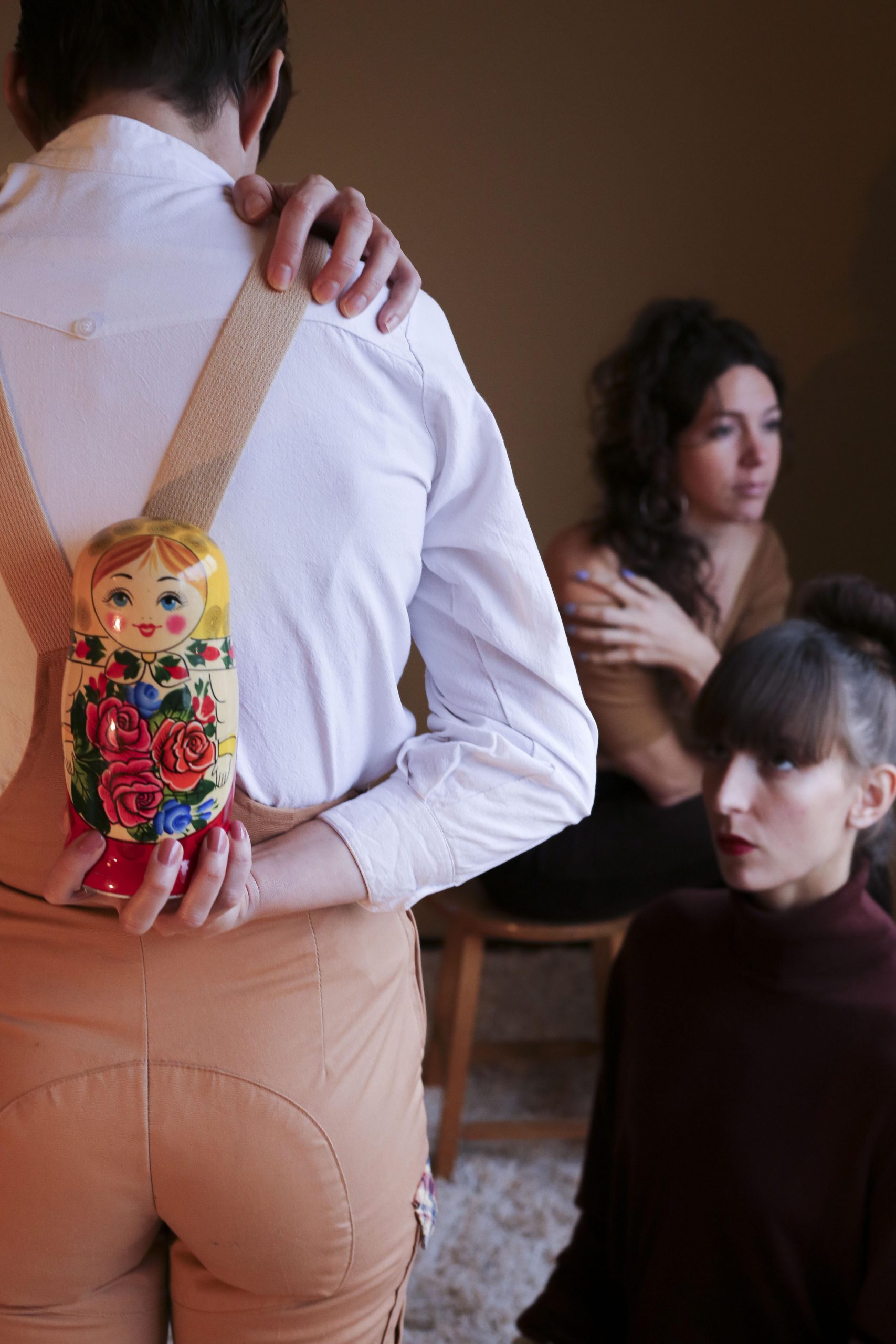 Trois femmes entrent dans la salle/scène. Mêlant bijoux, accessoires, chaussures à talons et tenues « chic », elles semblent davantage parées pour une sortie entre copines que pour une performance de danse contemporaine. Contrairement aux costumes, les chorégraphies sont « sages », presque timides. Les trois interprètent, entament un mouvement circulaire synchronisé, qu’elles nous présentent chacune à leur façon. Tandis que la première se recroqueville sur elle-même et tente de disparaître pour masquer son malaise, la seconde est au piano jusqu’à ce que le thérémine pique sa curiosité. Enfin, la troisième semble chercher sa place, entre angoisse et arrogance. Elle restera finalement au centre de la scène/salon pendant la majeure partie du spectacle.