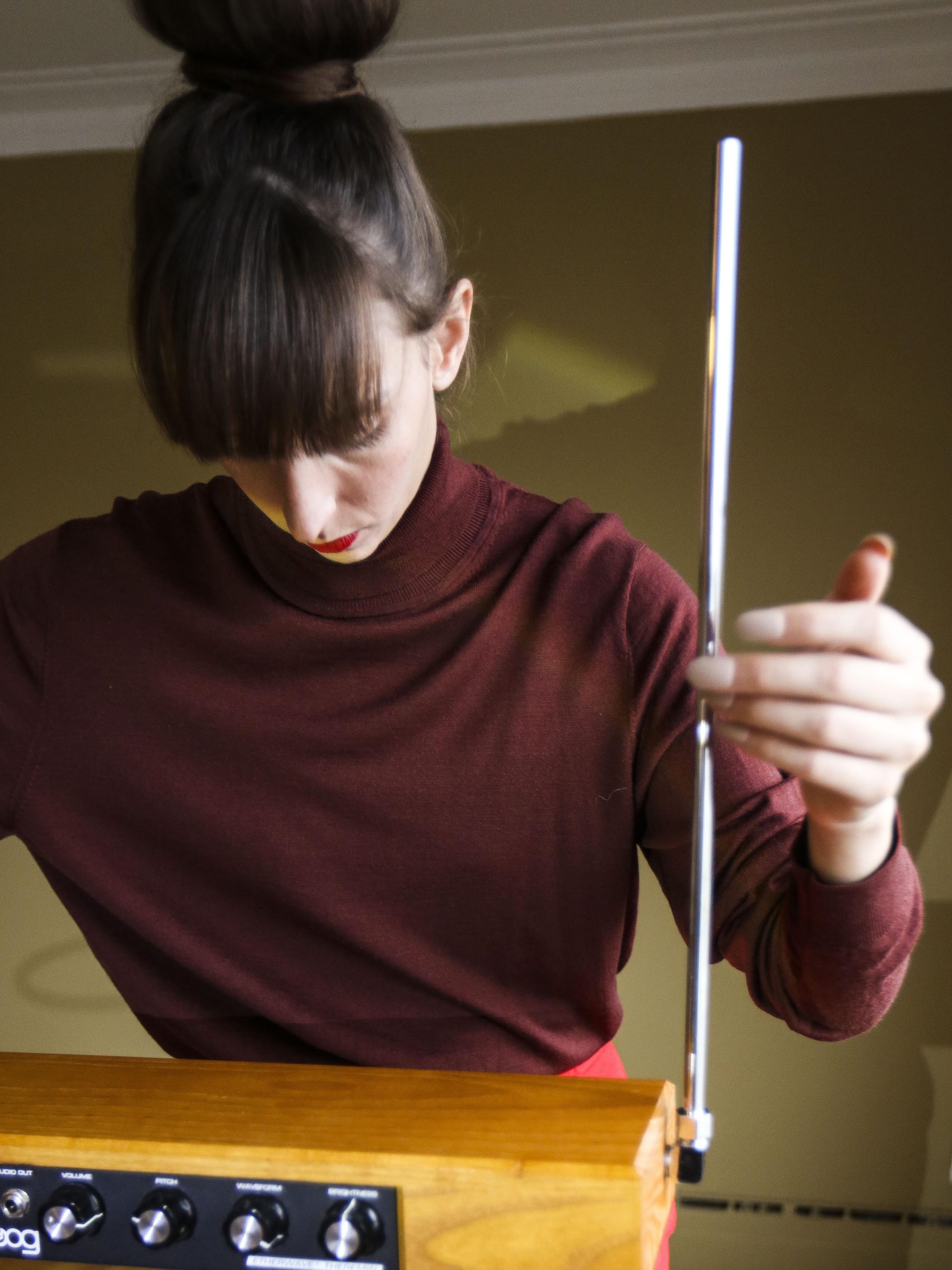 Un tapis « peluche » blanc/gris trône au centre de la salle. D’un côté, un rideau et un tabouret, de l’autre, un piano surplombé d’un tableau. Autour du tapis, des lampes DIY sont parsemées au sol. De nombreux instruments et des petits objets entourent également la scène. Parmi eux, un tourne-disque qui ne servira que dans les toutes premières minutes de la performance, et un thérémine qui sera, quant à lui, au cœur du spectacle. Il s’agit de l’un des plus anciens instruments de musique électronique, inventé en 1919. Sa particularité ? En plus de sa forme et de sa rareté, le thérémine émet des sons sans qu’on le touche.