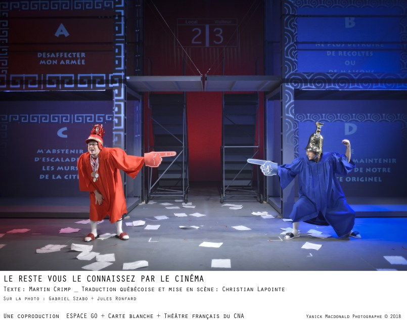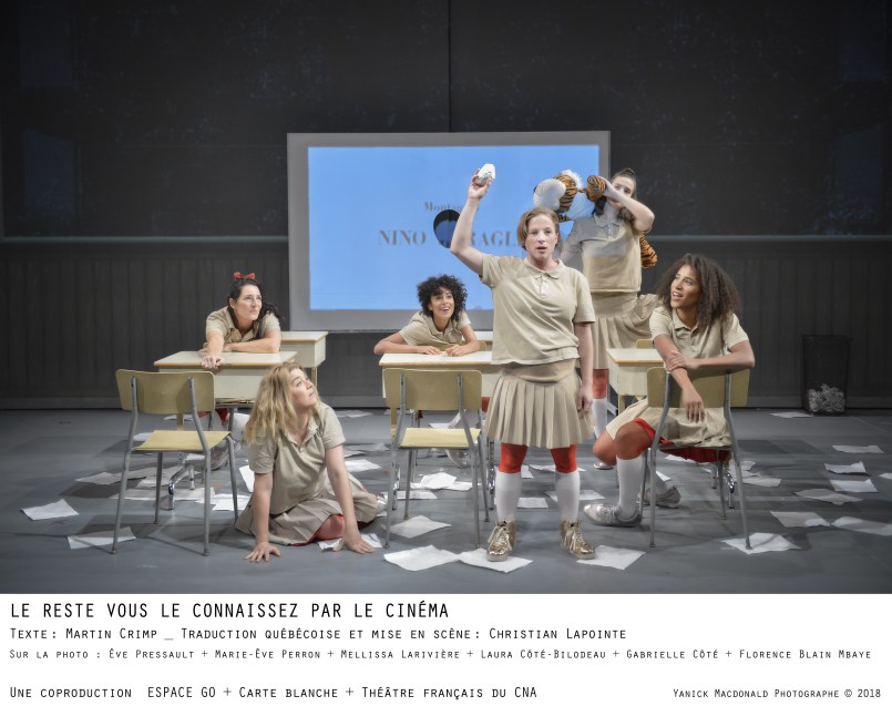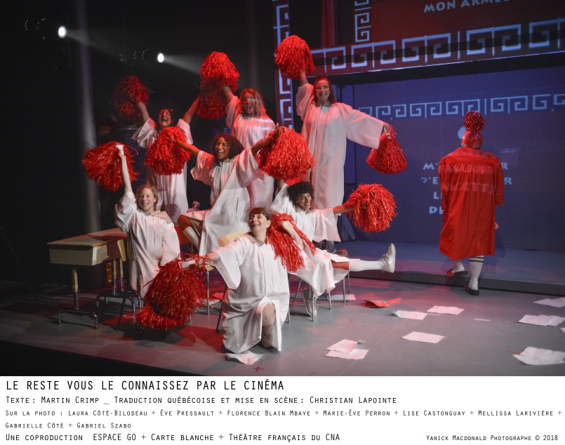 Le reste vous le connaissez par le cinéma, texte : Martin Crimp ; traduction québécoise et mise en scène : Christian Lapointe ; dramaturgie : Andréane Roy ; avec Marc Béland, Florence Blain Mbaye, Lise Castonguay, Claudia Chillis-Rivard, Gabrielle Côté, Laura Côté-Bilodeau, Melissa Larivière, Nathalie Mallette, Marie-Ève Perron, Ève Pressault, Éric Robidoux, Jules Ronfard, Paul Savoie et Gabriel Szabo, assistance à la mise en scène d’Emanuelle Kirouac ; décor : Jean Hazel ; lumières : Sonoyo Nishikawa ; vidéo : Lionel Arnould ; costumes : Elen Ewing ; musique : Nicolas Basque ; accessoires : Claire Renaud ; maquillages : Jacques-Lee Pelletier. À Espace Go (Montréal) jusqu’au 6 octobre.