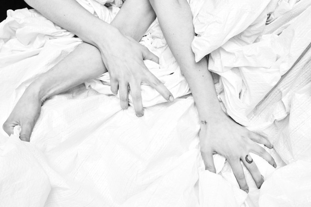 La performance The Daughters of Quiet Mind captive le public tout au long de ses trop courtes 25 minutes. Myriam Arseneault Gagnon nous tient dès le début. Pendant que les spectateurs prennent place, l’interprète, seule sur scène avec une longue bâche blanche, surplombée d’un néon qui traverse toute la scène en diagonale, a déjà amorcé sa danse en faisant les cent pas derrière la toile au sol. Ses gestes sont aussi discrets que l’ambiance sonore, légèrement stridente. Puis, dans une transition si fluide qu’elle paraît inexistante, le spectacle débute. Tout le monde est installé : le jeu commence. La danseuse s’exerce en de savantes modulations rappelant celles de l’automate, et ses séquences dansées s’entrecoupent, un geste à la fois, une partie du corps isolée à la fois, entre chaque respiration. La danse a quelque chose de ludique et sérieux mais, surtout, de complètement hypnotique.