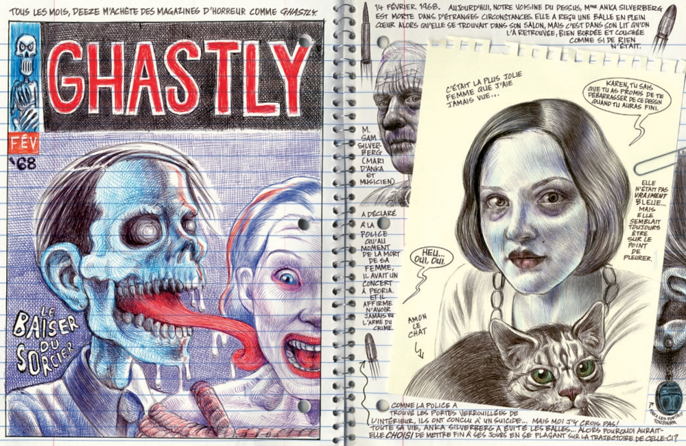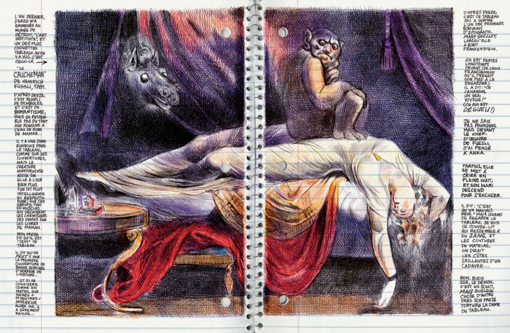 Cela dit, l’art ne se cantonne pas au texte écrit. Tout le livre suinte l’art. Emil Ferris a réalisé un tour de force en dessinant les images qui le composent entièrement au stylo à bille : leur réalisme est époustouflant. Mettant de côté la forme habituelle de la bande dessinée, dans laquelle les planches de cases se suivent, l’artiste a opté pour une mise en page qui colle de près à celle du journal et dans laquelle le texte s’insère à travers des images dispersées sur les feuillets. Ici, un détail qui colle à une description ; là, un plan d’ensemble qui résume une pensée. Les images sont une porte ouverte sur la réalité telle qu’elle est perçue par Karen : dure, bizarre, crue, remplie, tendre. Ferris s’est approprié les œuvres pour les faire vivre à travers ses personnages et son livre. Chaque chapitre est annoncé par la page couverture d’un magazine (offert par Deeze) sur laquelle des monstres agissent comme amorces pour la suite de l’histoire. Les reproductions d’œuvres abondent au cours des pages et leur interprétation par l’enfant donne lieu à de véritables réappropriations.