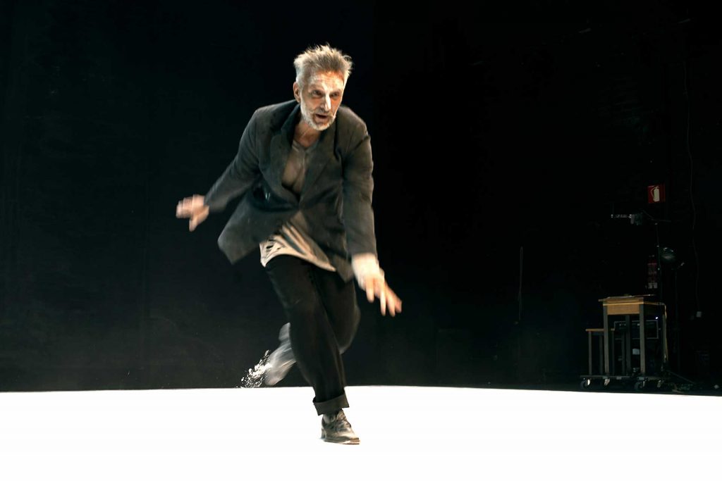 Avec la voix vient la parole, avec la parole suivent les textes, puis l’amour. Alors qu’il déclame de la poésie (« J’attache de la valeur à… être reconnaissant pour quelque chose qu’on a oublié / deux personnes âgées qui s’aiment… ») toutes ses articulations se délient : petits gestes des poignets, chevilles, épaules, cou, il se déplace comme un boxeur dans l’arène, qui enfile ses protections, se défait de sa robe, embarque sur le ring. Du ciel, on lui jette d’ailleurs ses chaussures, et la folie s’empare de lui dès qu’il les enfile ; il soliloque (en catalan ?), devient possédé du diable, comme dans le conte auquel la danse avait auparavent fait une si belle part. L’éclairage jaunit, l’artiste se replie sur lui-même, la trame sonore rend uniquement l’écho de pas anonymes, qui redoublent ceux du danseur alors qu’il s’emballe, fait le tour de la scène en claquant des pattes – cla-clac, comme les adeptes du flamenco, dont l’affirmation passe par le rythme et le claquement des talons. Il court en cercles, comme s’il se trouvait dans une arène, et la craie du sol se soulève. Quand il s’épuise, la lumière, devenue bleue, accompagne ses paroles, à nouveau adressées au quatrième mur : « I’m falling / hold me ». Puis il tombe, mais demeure infatigable ; accoudé au sol, il se met à chanter.