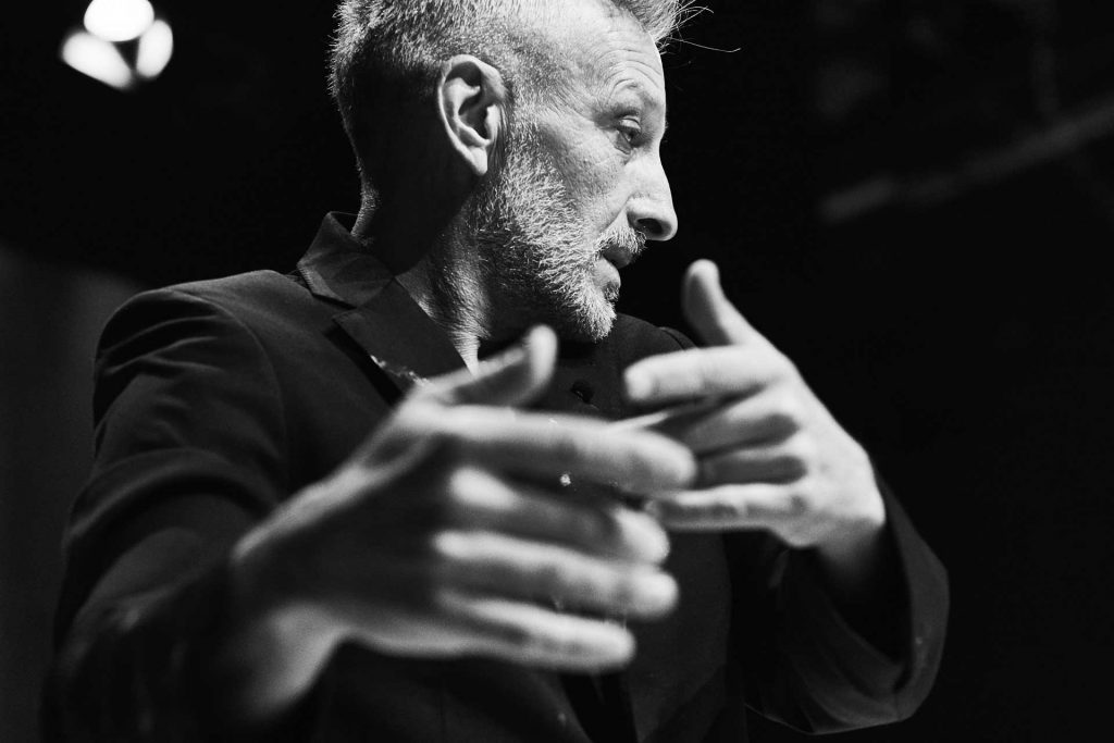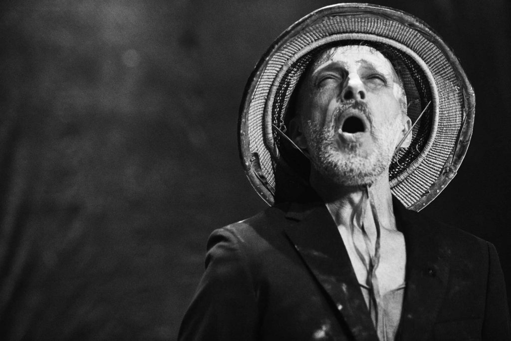 Après la moitié de la pièce, la voix a déjà connu plus de quatre stades différents : de déclamation, elle passe à soliloque, à supplication, puis à chanson. Ces états continueront à se démultiplier, jusqu’au point culminant du conte. Ramis s’assied au bureau d’écolier, dessine pour appuyer, d’une projection murale simultanée, le conte de l’homme qui recherchait la vérité en gravissant une montagne. Au final, c’est l’impression la plus forte, celle qui restera gravée en nous. Elle dominera celle d’avoir eu beaucoup à assimiler en une heure, surpassera les nombreux registres très différents et les (tout aussi nombreuses) interventions techniques (qui passaient pourtant inaperçues) : on se rappelle les mimiques et les rires caricaturaux, les poèmes (et le texte de Erri de Luca), les innombrables états de corps, prenant par moments l’allure de personnages, soutenus par des éléments de costumes ou de décor et, bien sûr, par des modulations de la voix. Mais la clef de lecture, on la trouve dans ce conte de l’homme qui cherche la vérité en gravissant la montagne : tout est up and down, tel que le répète Ramis dans plusieurs langues. Comme la montagne, et même comme lui, le danseur, qui se verra suspendu pour chanter ; comme la voix qui s’élève, qui monte et descend, comme les corps, qui se lèvent au quotidien ou qui grandissent jusqu’à s’effondrer – qui spirituellement, aussi, s’élèvent, se couchent. S’il est bien une chose dont Ramis est certain, en vérité, c’est que tout est une question de verticalité, de rapport entre le bas et le haut, entre ciel et terre.