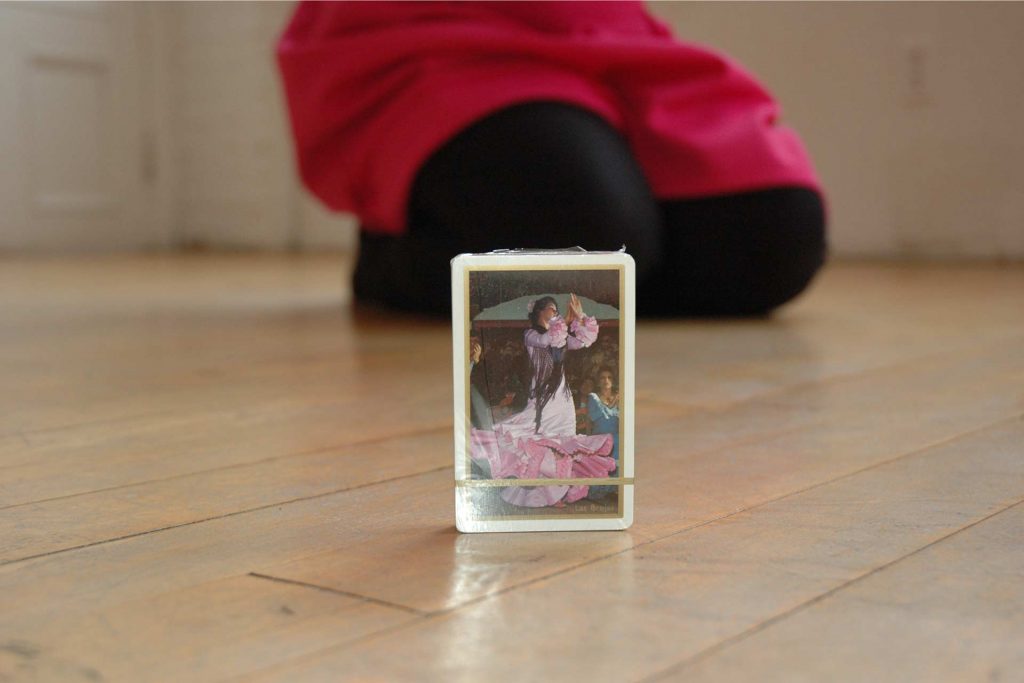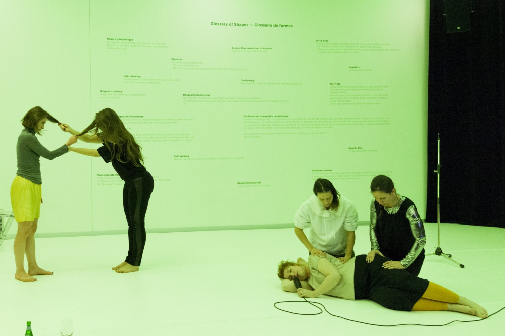 Un glossaire des formes est inscrit au mur. Il se retrouve également dans le fort joli dépliant qu’on nous tend à l’entrée, à l’endos d’un texte signé de la main de Véronique Hudon. La trame de la soirée suit dans le désordre ce glossaire, qui se présente comme une série d’exercices ou d’explorations à travers lesquelles sont ouvertes des fenêtres sur différentes pratiques, sur différentes mises en rapport entre les aspirations de la danse, de la représentation de soi et des autres. La participation du public est sous-entendue. Déjà, boire un verre, s’installer quelque part dans cet espace, où les artistes circulent au même titre que nous, dans cet éclairage et ce dispositif où nous sommes également vus, nous impose forcément un rôle. Loin de se trouver en danger, le public est traité avec soin : même dans le risque, les artistes façonnent un espace où la bienveillance l’emporte largement sur l’inconfort que tout humain normalement constitué ressent devant la présence des autres.