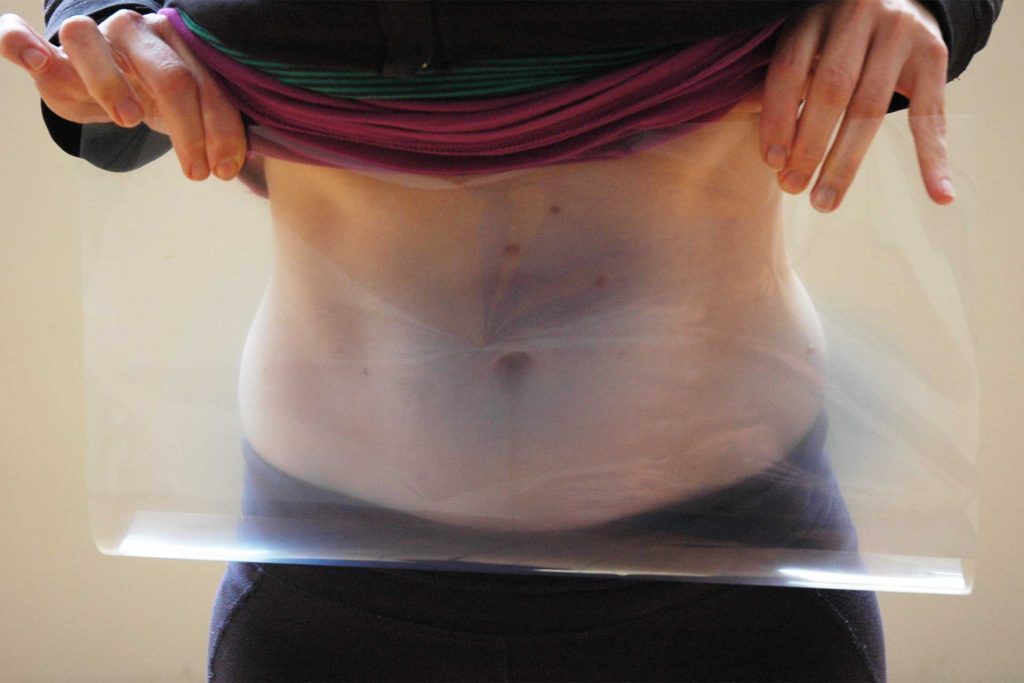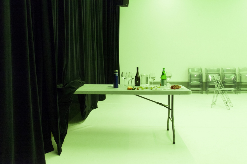 L’idée était d’ouvrir un espace public afin de rendre possible la diffusion de ce qui avait été proposé et exploré, en séminaire, lors d’une résidence à l’Agora de la Danse puis, par la suite, dévoilé lors de répétitions pendant deux ans. En se distanciant de l’aspect plus spectaculaire, les directrices artistiques (Katya et Nadège) expliquent, en parlant d’anti-spectacle, qu’elles avaient envie de questionner le cadre de la représentation. On sent, en effet, que la matière déborde du spectacle ou, pour le dire plus justement, de la réunion à laquelle le public est convié dans l’espace Wilder. L’espace blanc, éclairé de néons verts et roses, dans lequel sont éparpillés chaises, verres de bulles, assiettes de fruits, offre un support bien différent du dispositif à l’italienne. Il permet de créer une ambiance qui se rapproche davantage de la rencontre (on pense à un vernissage, à un souper entre amis) que du spectacle. À l’intérieur de ce cadre, le public et les artistes se confondent, se mélangent, et sont amenés tour à tour à participer à l’exploration menée.