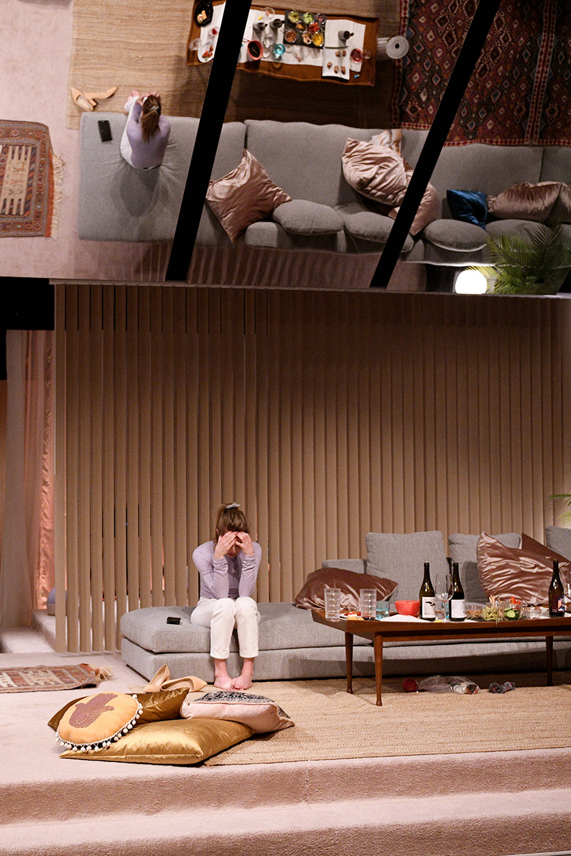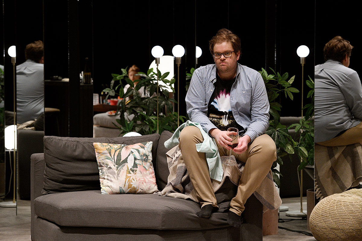 Pour accentuer cet hyperréalisme, Sylvain Bélanger a choisi un décor faste dans une disposition frontale (au contraire des pièces précédentes de Chabot, présentées en bi-frontal), peut-être pour donner l’impression d’observer ces êtres comme on observerait des animaux dans une cage. Les gigantesques et nombreux miroirs, placés en différents angles au fond de la scène et au plafond, multiplient les corps comme autant d’images et surfaces de projection d’eux-mêmes, mais aussi les points de vue que les spectateurs peuvent avoir sur eux.