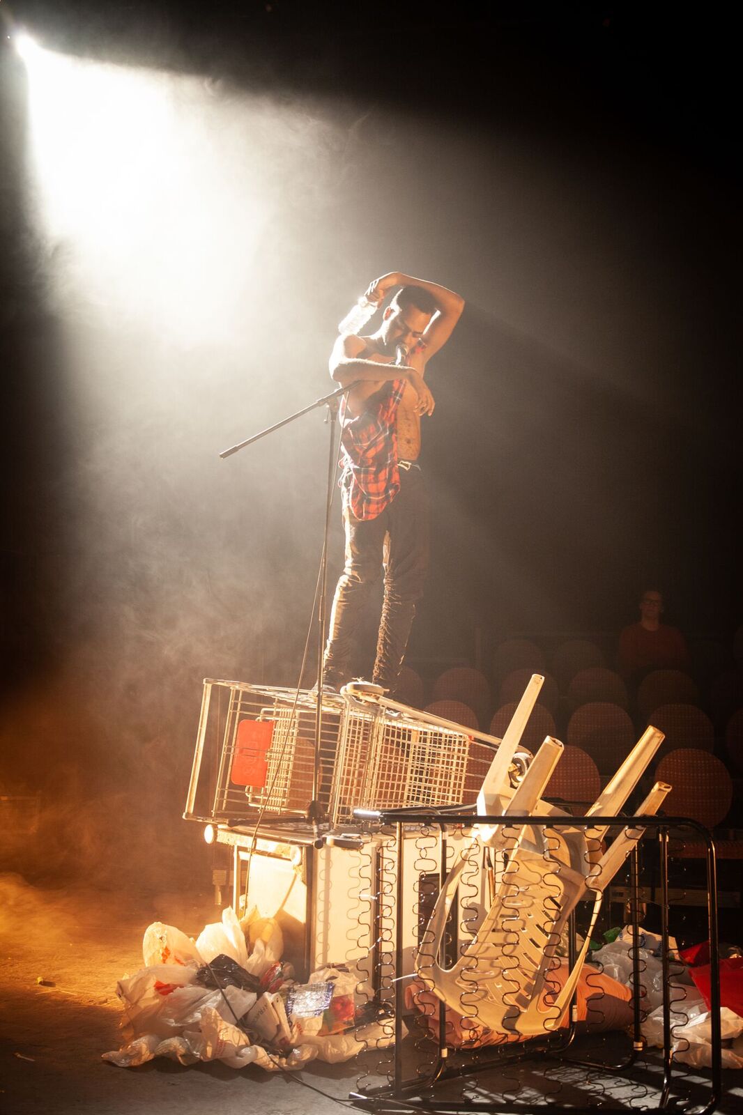 C’est aussi ce qui permet à la notion de prise de parole d’occuper autant de place dans ce spectacle, comme le suggère son titre. Gagnon critique notre apathie collective, le fait que nous sommes tellement conditionné·es par la société (patriarcale, libérale, capitaliste, etc.) que nous préférons nous taire et nous soumettre aux instances disciplinaires pour ne pas faire de vagues, c’est-à-dire pour ne pas troubler le confort que nous assure notre conservatisme.