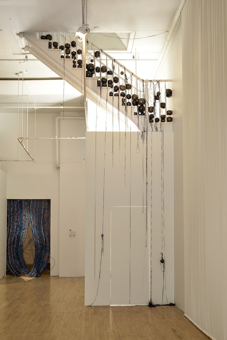 En avant-plan : Giorgia Volpe, Avalanche de la raison (exercice de mémoire # 5), 2018. Installation : pelotes de bandes magnétiques déposées sur un escalier tronqué ; en arrière-plan : Giorgia Volpe, L’origine du monde (portail), 2014-2018. Installation : tubulure bleue acéricole. (photo) : Daniel Roussel.